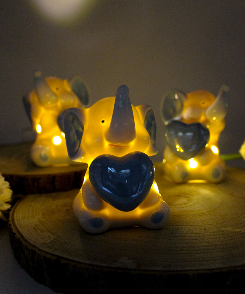Con dimensioni 6,5×h.8,5 cm, il profilo raffinato dell’elefantino viene valorizzato dalla luce soffusa, rendendolo anche un complemento decorativo per camerette o ambienti speciali.