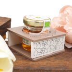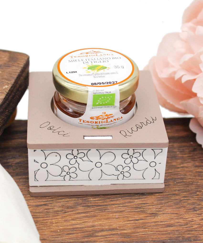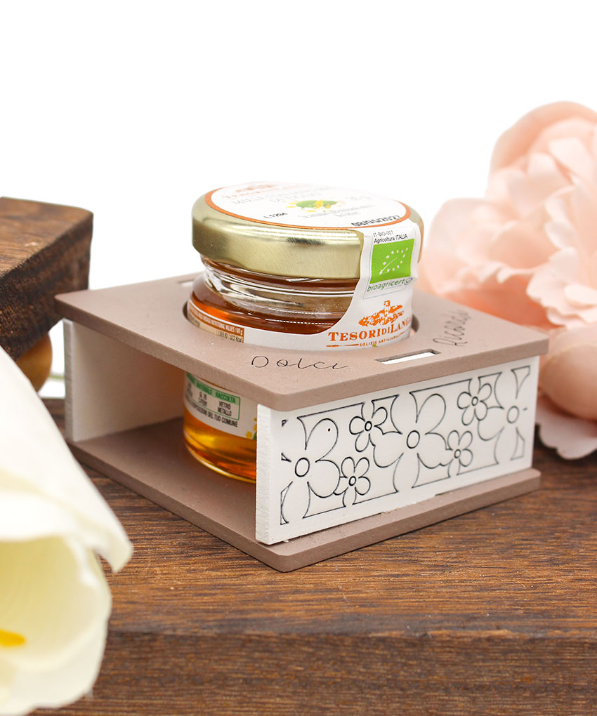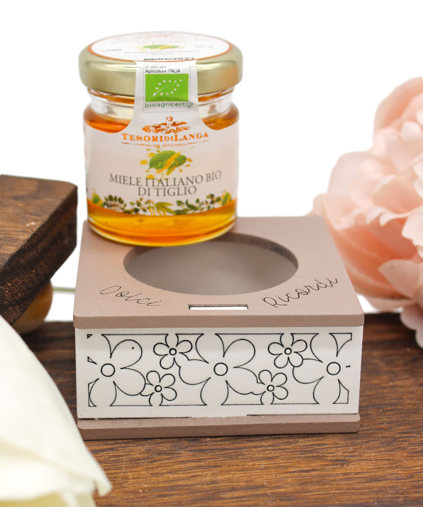 Il contenitore in legno, disponibile in rosa, celeste, tortora o beige, ospita 1 scomparto con una marmellatina o miele della rinomata marca Tesori di Langa, eccellenza italiana nel settore gastronomico.