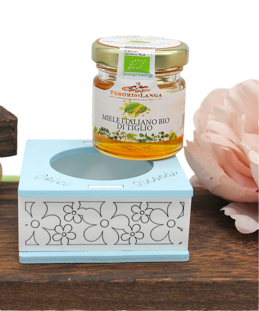 Il contenitore in legno, disponibile in rosa, celeste, tortora o beige, ospita 1 scomparto con una marmellatina o miele della rinomata marca Tesori di Langa, eccellenza italiana nel settore gastronomico.