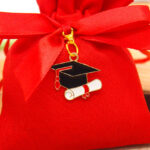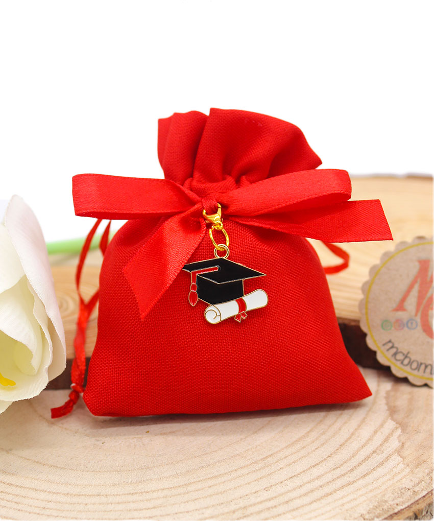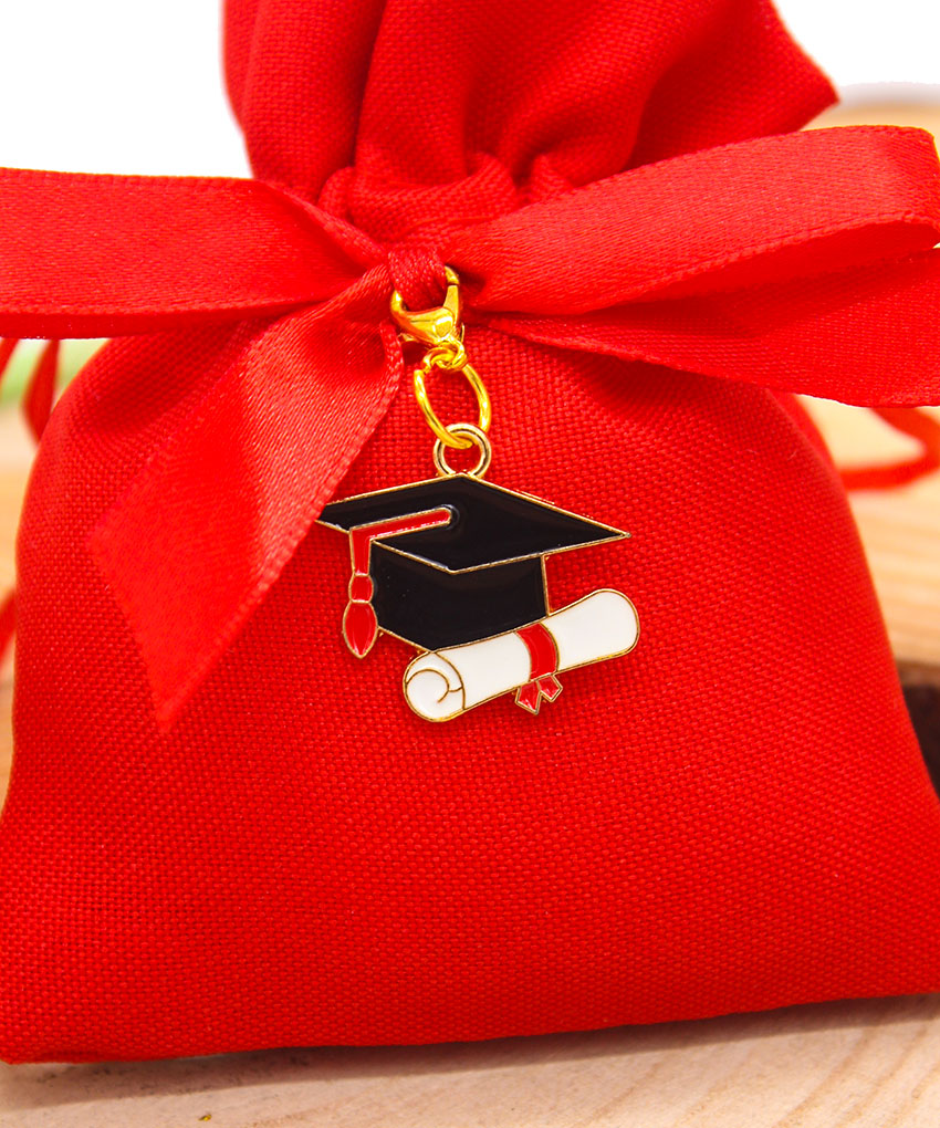 Misure del sacchetto: 9 cm x 11 cm – Colore: Rosso – Materiali: Stoffa (sacchetto) – Metallo (applicazione con moschettone) – Applicazione: Tocco da laureato nero e oro con moschettone – Confetti: 5 confetti al cioccolato inclusi – Confezione: Inclusa nel prezzo