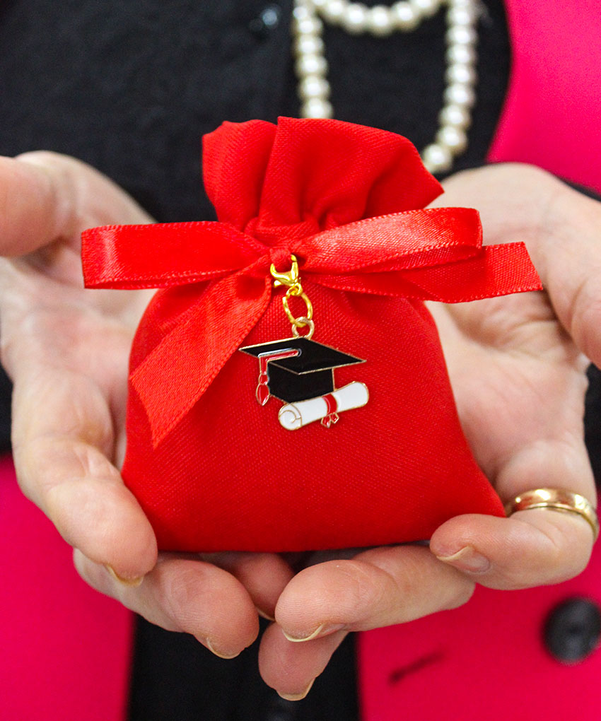 Il sacchettino rosso in stoffa, simbolo di fortuna e passione, è arricchito da un’esclusiva applicazione a forma di tocco nero e oro, agganciata con un piccolo moschettone in metallo: un dettaglio raffinato che rappresenta il successo raggiunto e l’inizio di nuovi orizzonti.