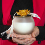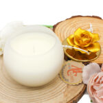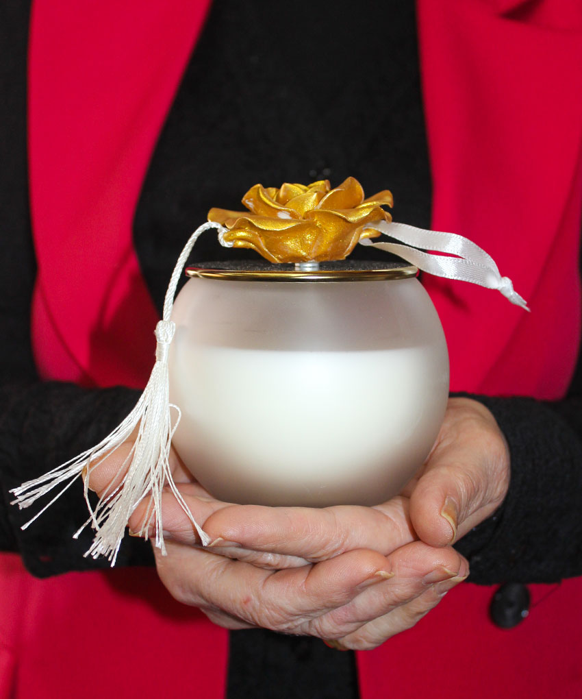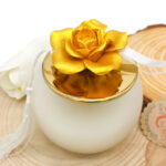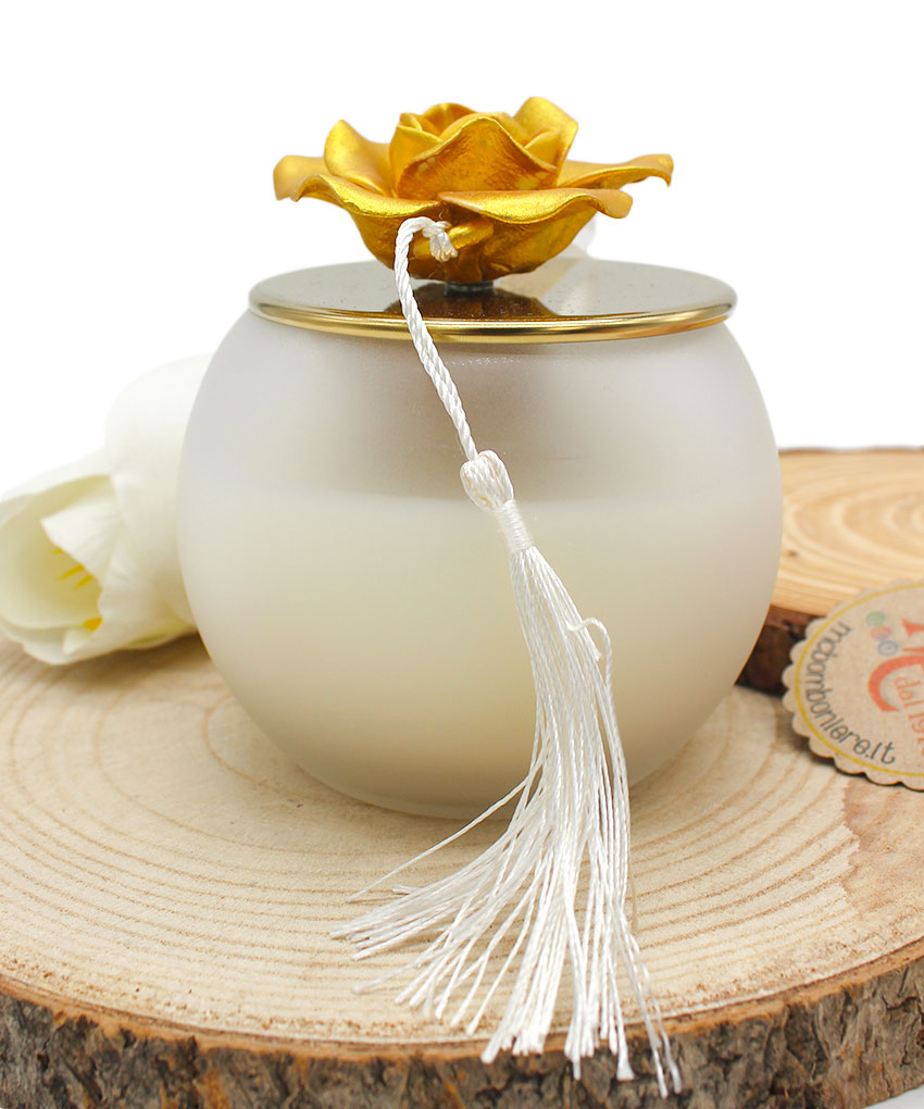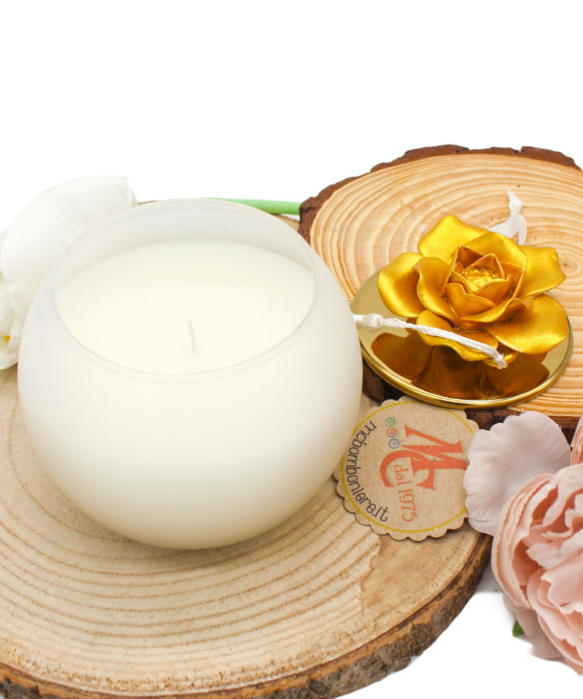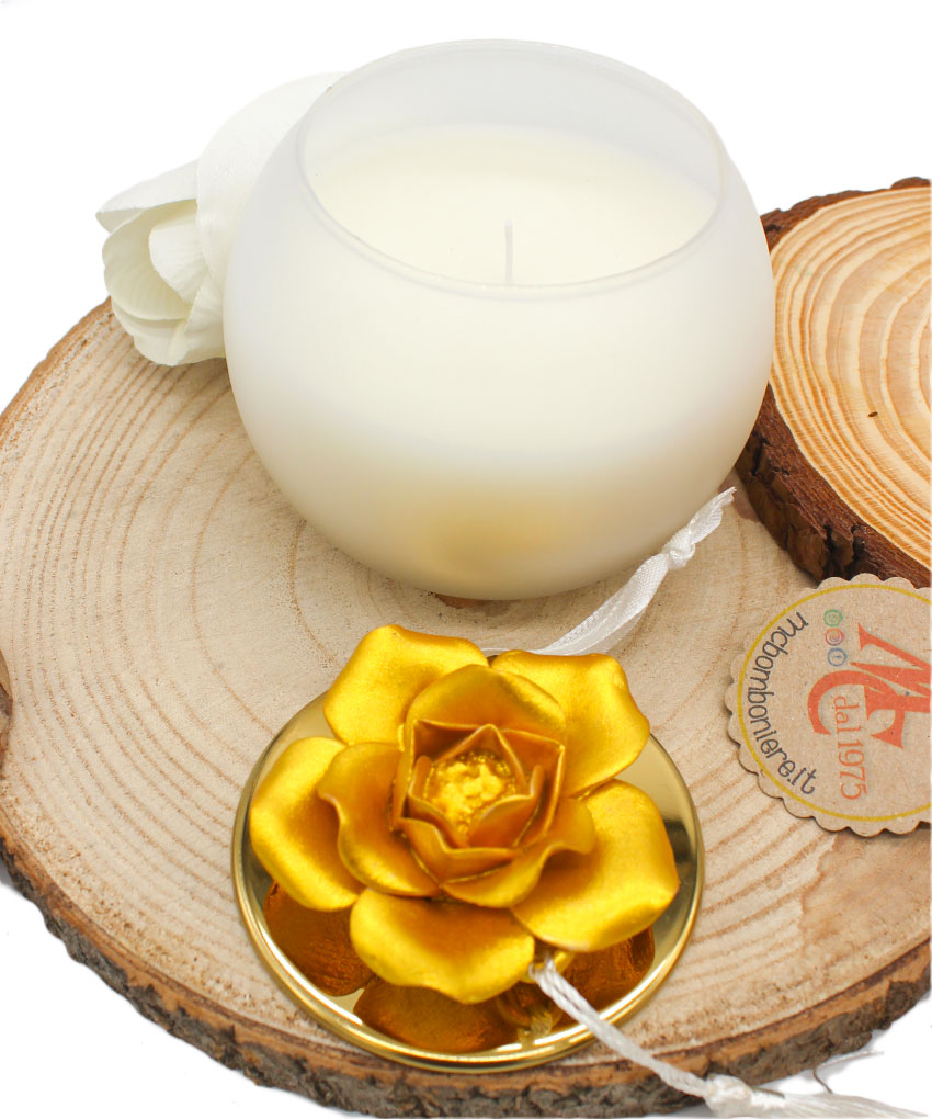 Aggiungi un tocco di eleganza e raffinatezza al tuo evento con questa bomboniera candela profumata. Il suo contenitore sferico in vetro è impreziosito da una splendida applicazione floreale in porcellana color oro, rendendola un’idea regalo perfetta per ogni occasione speciale.
