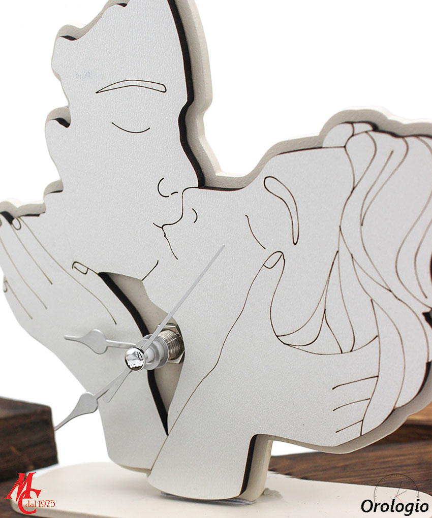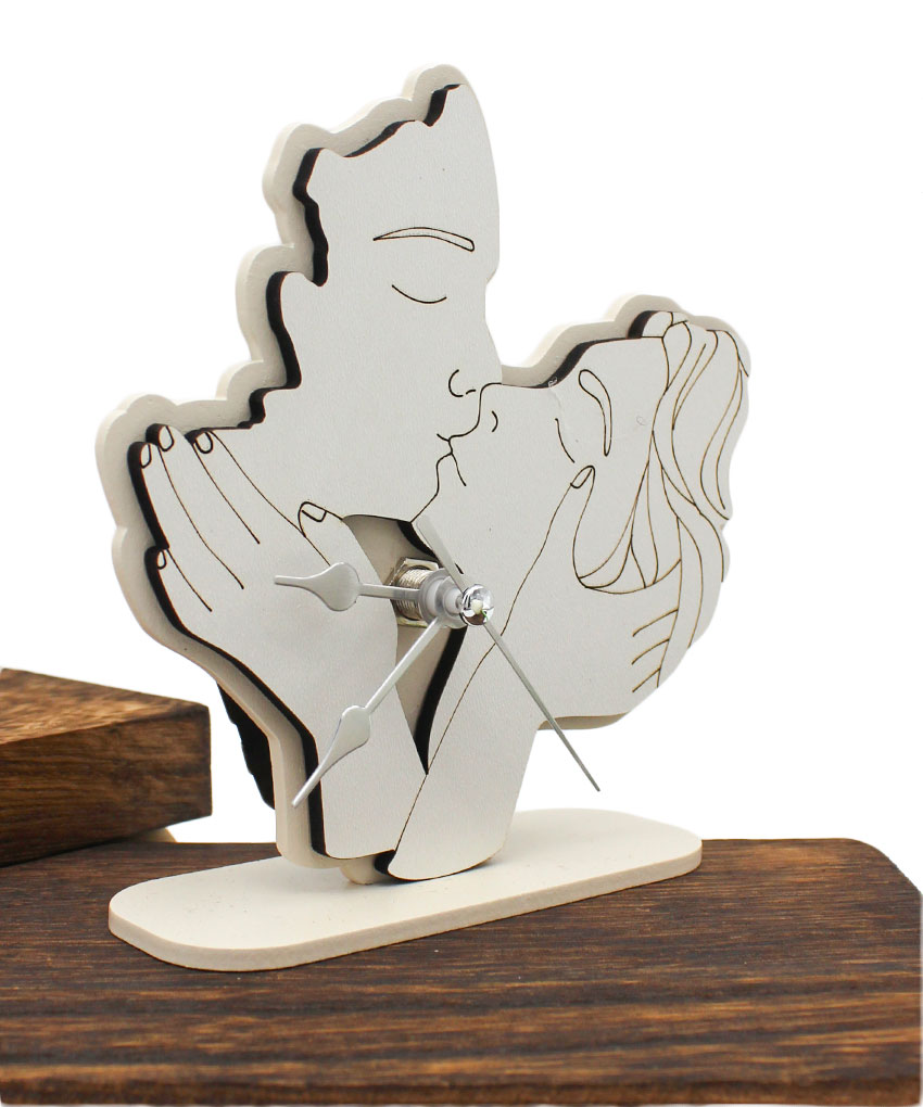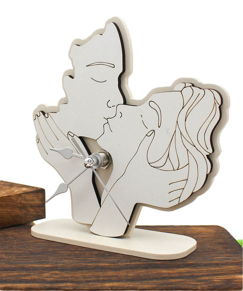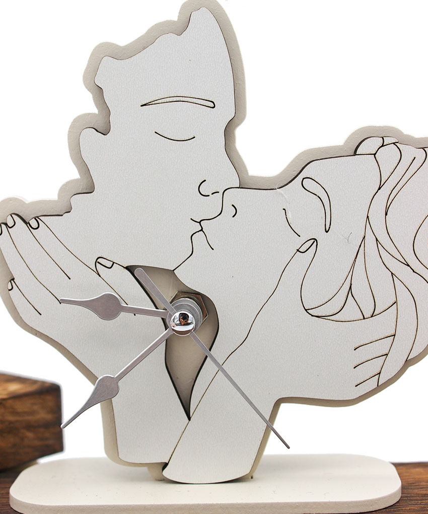 Tipologia: Orologio da appoggio decorativo – Motivo: Volti stilizzati in un bacio, con scritta Love – Colori: Beige e Bianco – Materiale: Legno intagliato al laser