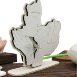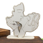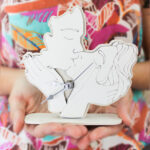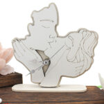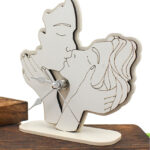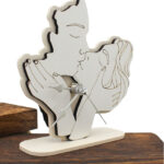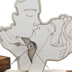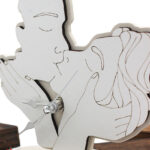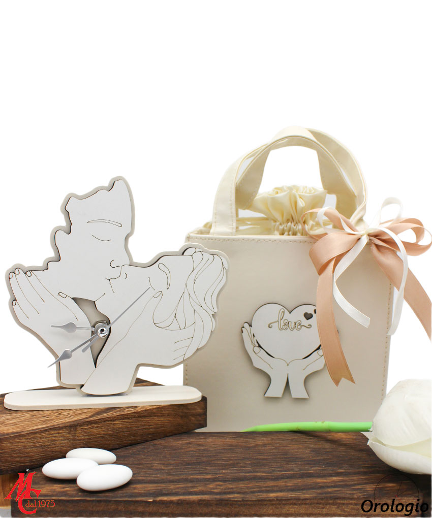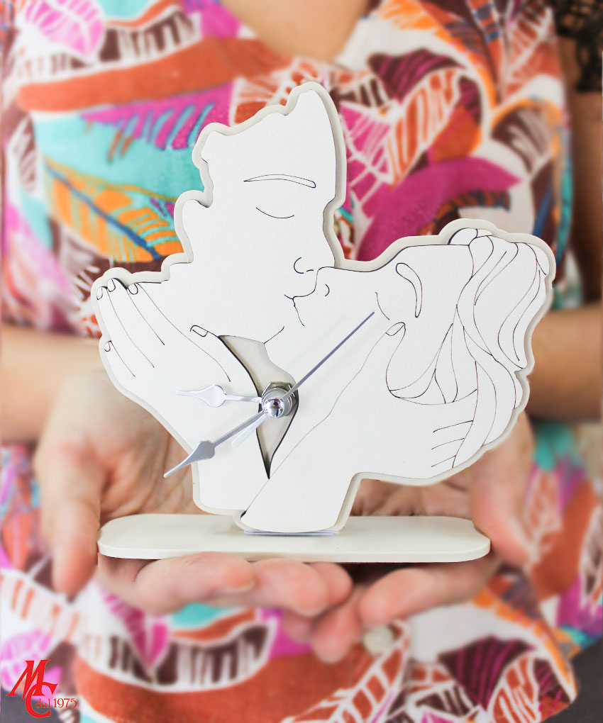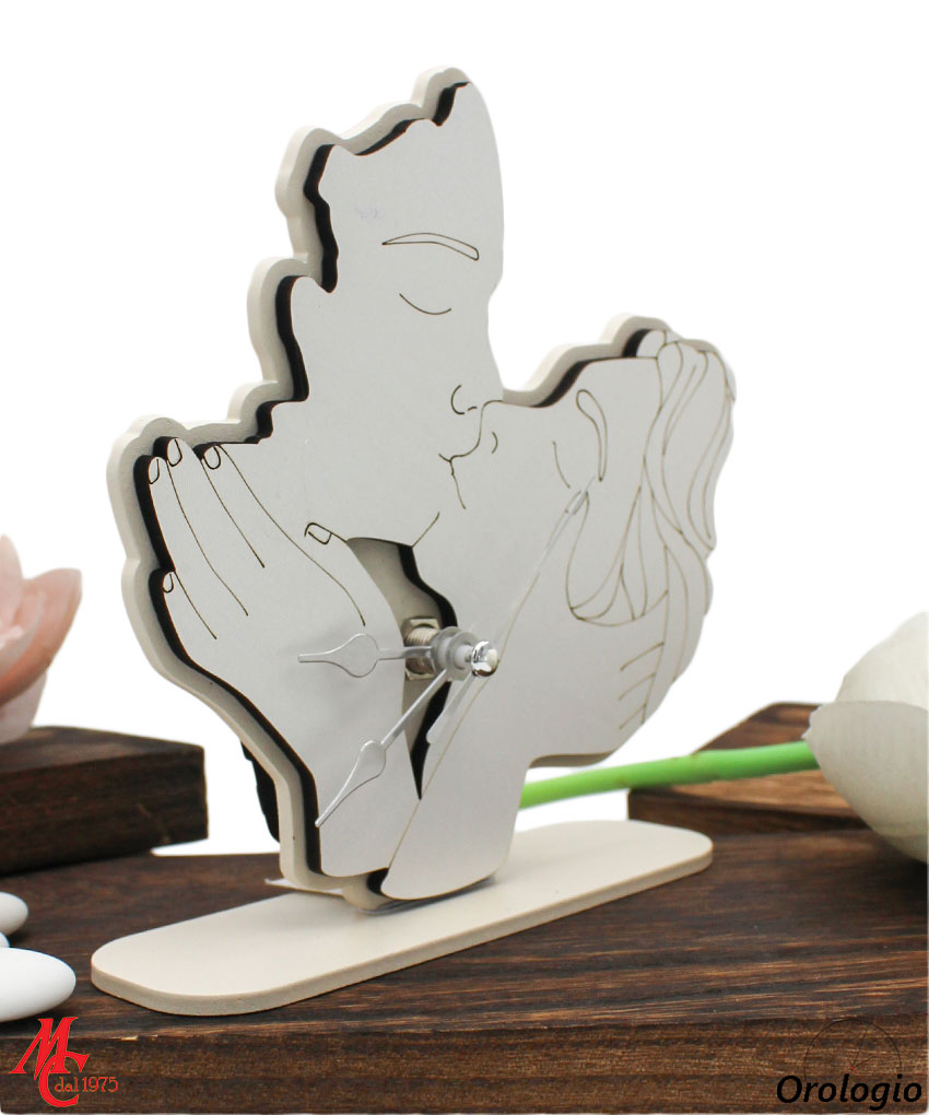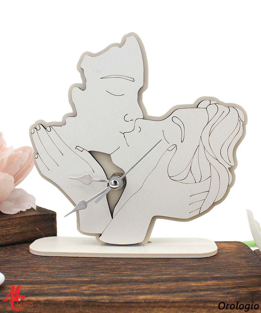 Tipologia: Orologio da appoggio decorativo – Motivo: Volti stilizzati in un bacio, con scritta Love – Colori: Beige e Bianco – Materiale: Legno intagliato al laser