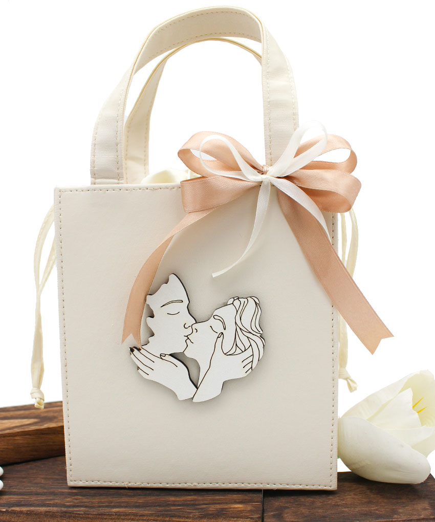 Questa bomboniera è realizzata in eleganti tonalità beige e bianco, con finiture curate e stile moderno.