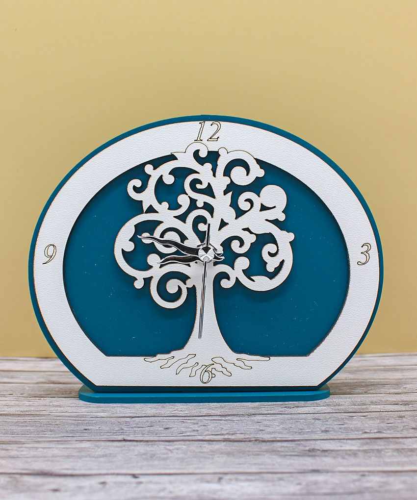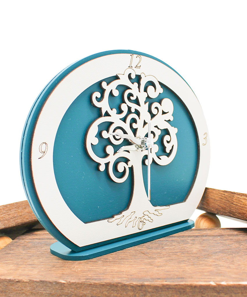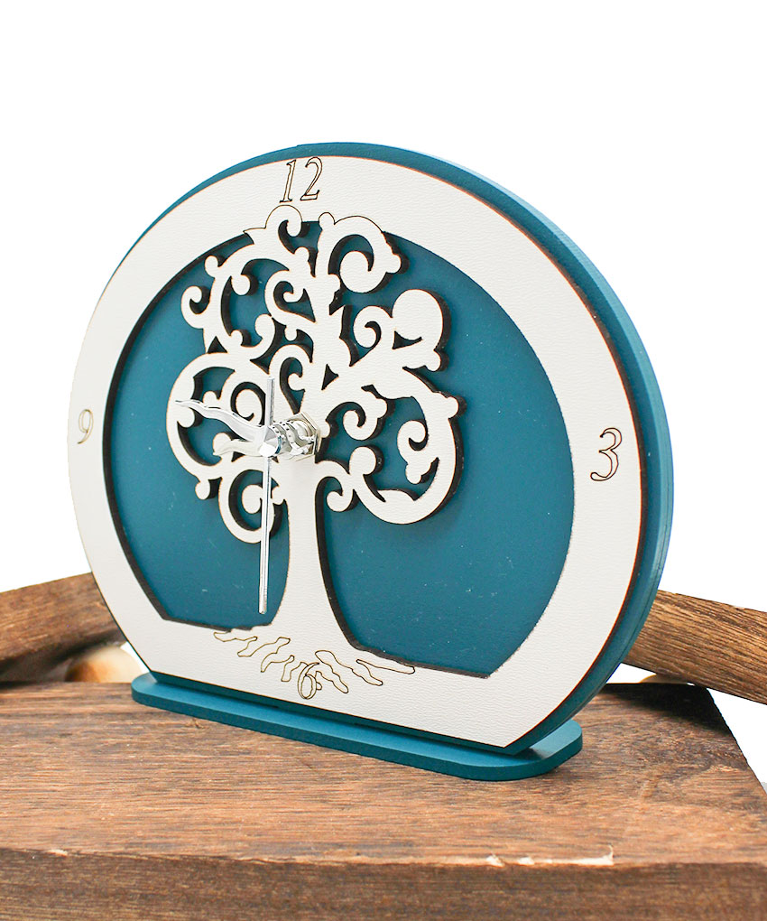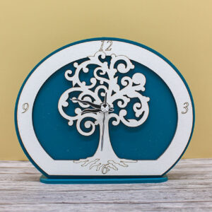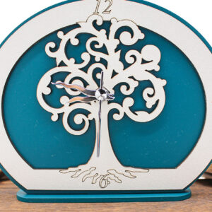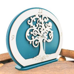 Orologio da tavolo con Albero della Vita in legno intagliato, colore ottanio. Bomboniera elegante e simbolica. Dimensioni 17 × 14 cm.