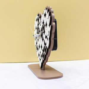 Realizzato in legno intagliato al laser, l’orologio si distingue per la precisione delle lavorazioni e per la raffinata finitura color fango, una tonalità calda e contemporanea che si adatta armoniosamente a qualsiasi ambiente. Le dimensioni di 14 × 12 cm lo rendono perfetto come complemento d’arredo da tavolo o da mensola, unendo estetica e funzionalità.
