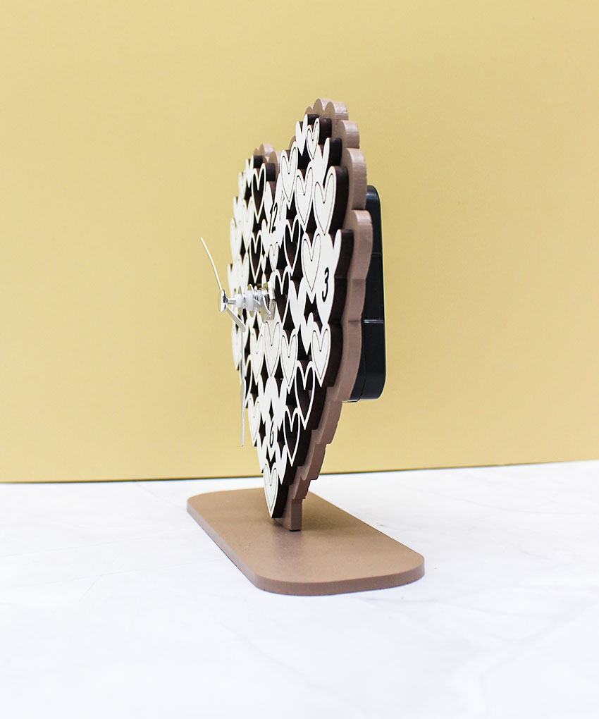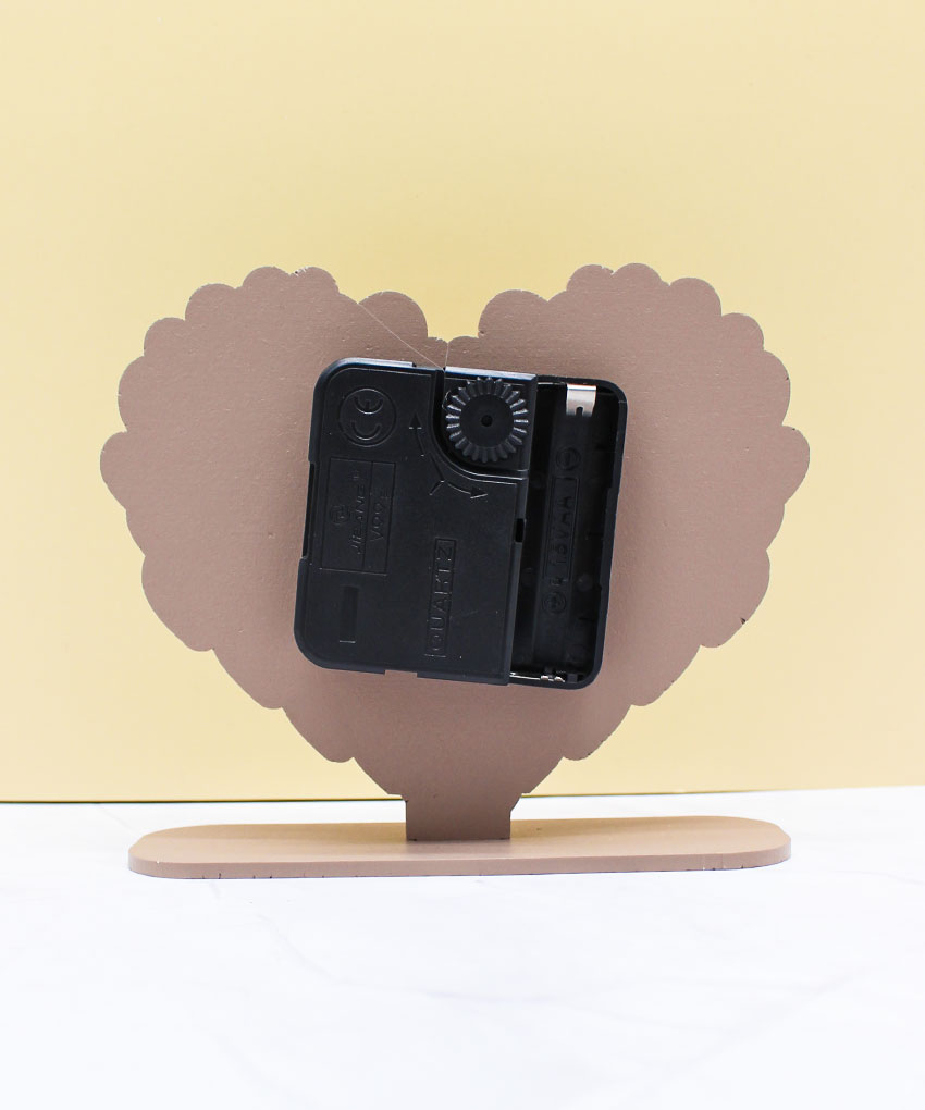 Orologio da tavolo a forma di cuore in legno intagliato, colore fango. Bomboniera elegante e simbolica per eventi speciali. Dimensioni 14 × 12 cm.