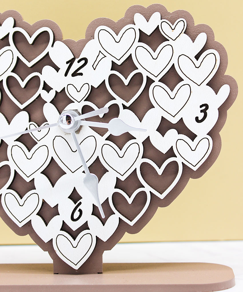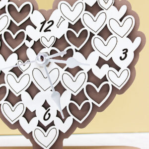 Bomboniera Orologio a Forma di Cuore in Legno Intagliato colore Fango – 14 × 12 cm
