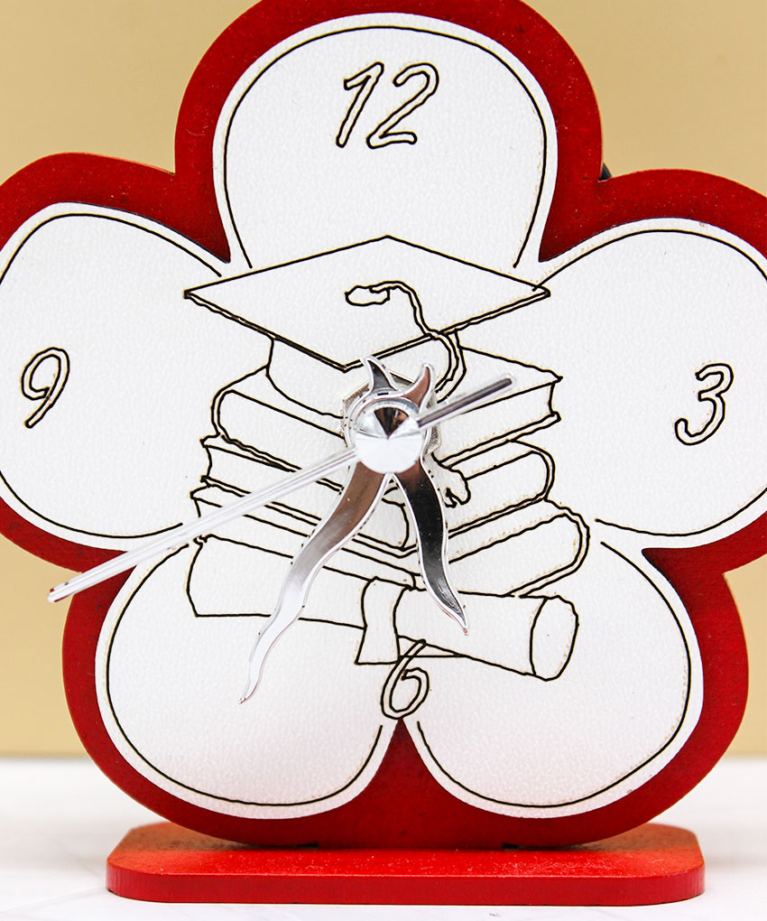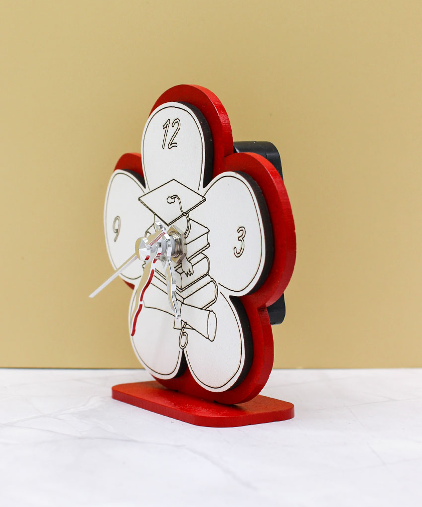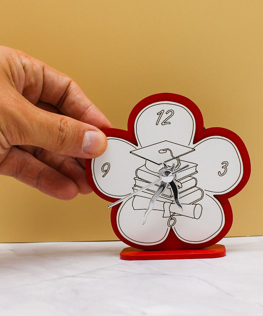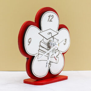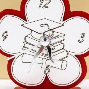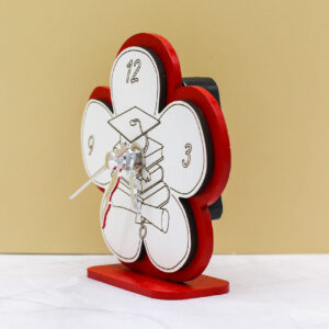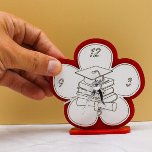 Realizzato in legno intagliato, questo orologio da tavolo si distingue per il design armonioso a forma di fiore, simbolo di crescita, realizzazione e nuovi inizi. La colorazione rossa, tradizionalmente legata alla laurea, conferisce carattere e valore all’oggetto, rendendolo perfetto come ricordo di un momento così importante.