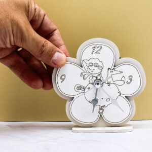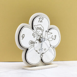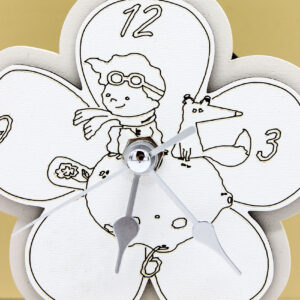Orologio Piccolo Principe a forma di fiore in legno intagliato colore sabbia. Bomboniera delicata e decorativa. Dimensioni 10 × 10 cm.