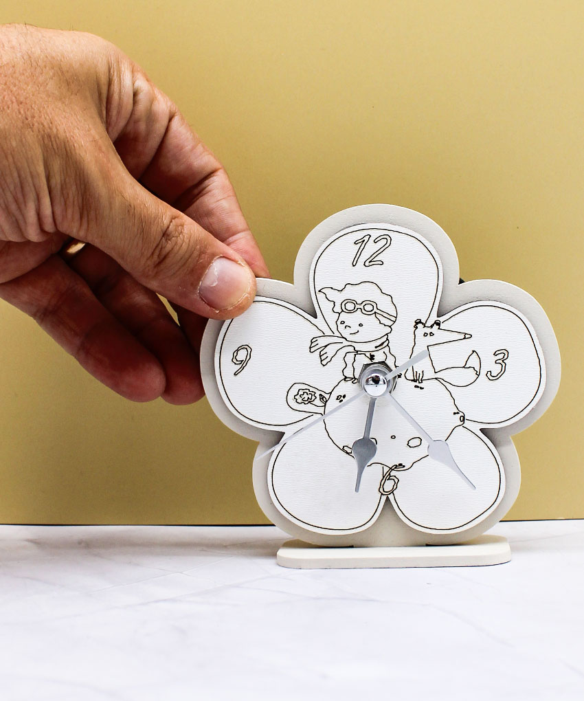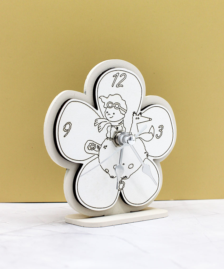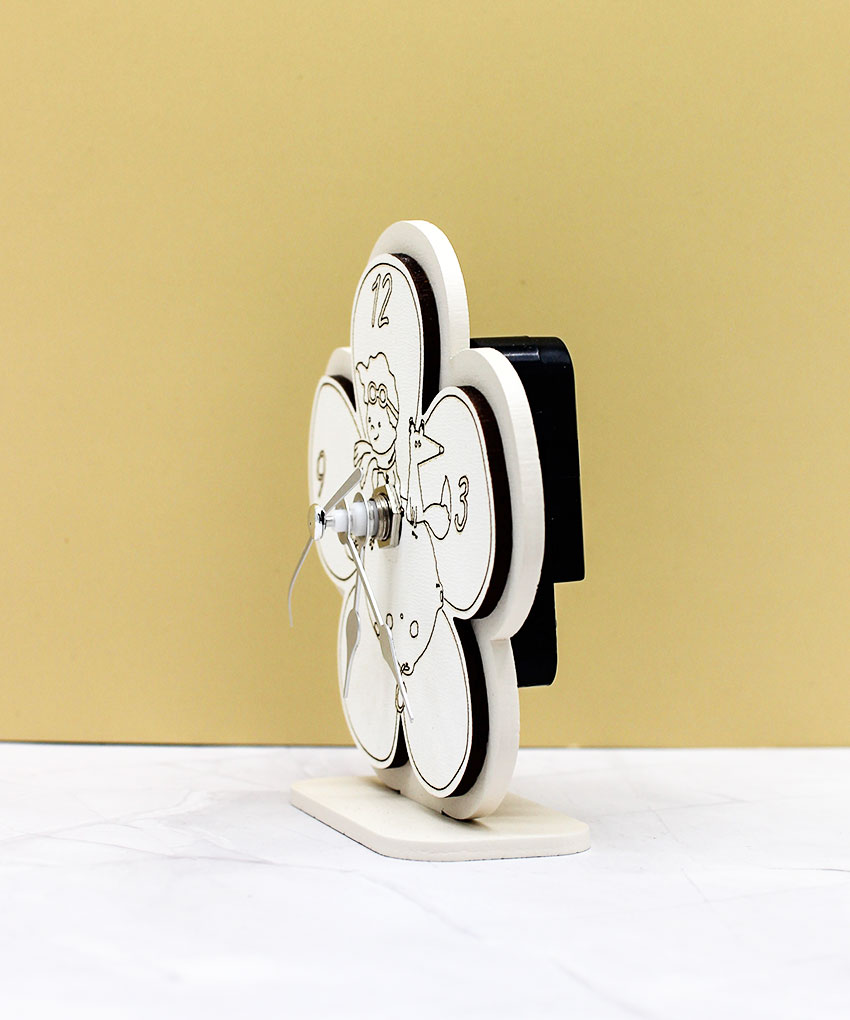 Realizzato in legno intagliato, questo orologio si distingue per il design armonioso a forma di fiore, impreziosito dalla figura del Piccolo Principe, simbolo di purezza, sogno e amore. La tonalità sabbia conferisce un aspetto caldo e naturale, perfetto per allestimenti eleganti e raffinati.