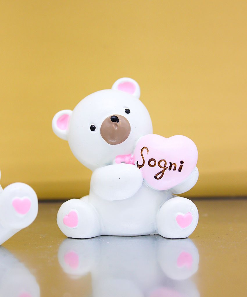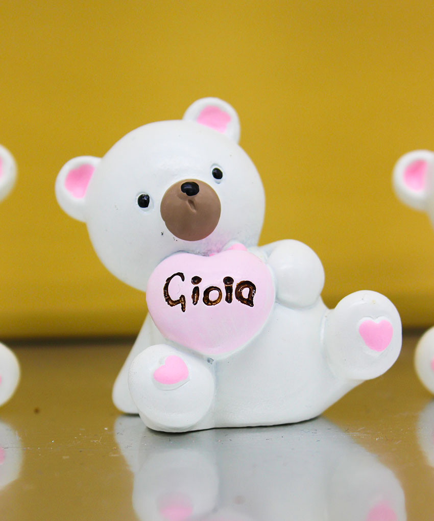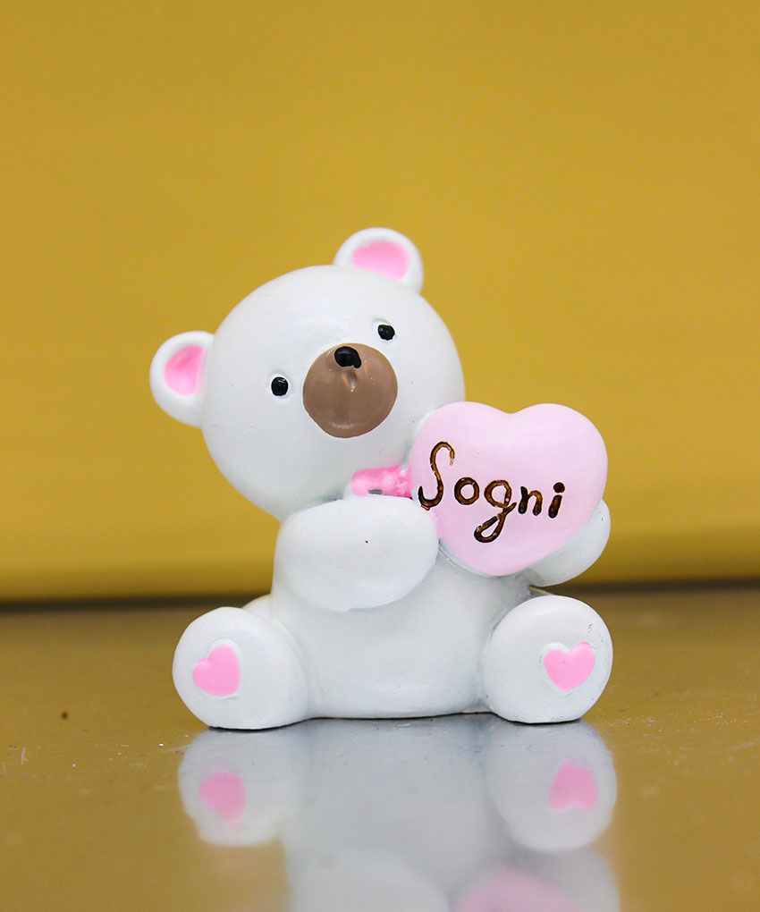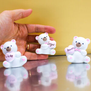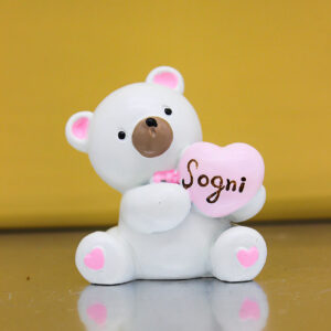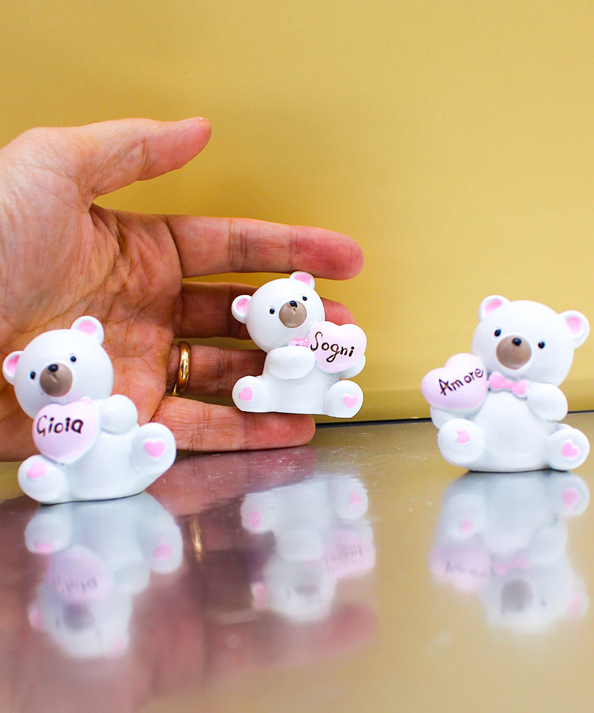 Realizzato in resina con finitura colore Rosa, questo grazioso orsetto è disponibile in 3 modelli assortiti, ciascuno decorato con un cuore e una delicata incisione con parole simboliche: