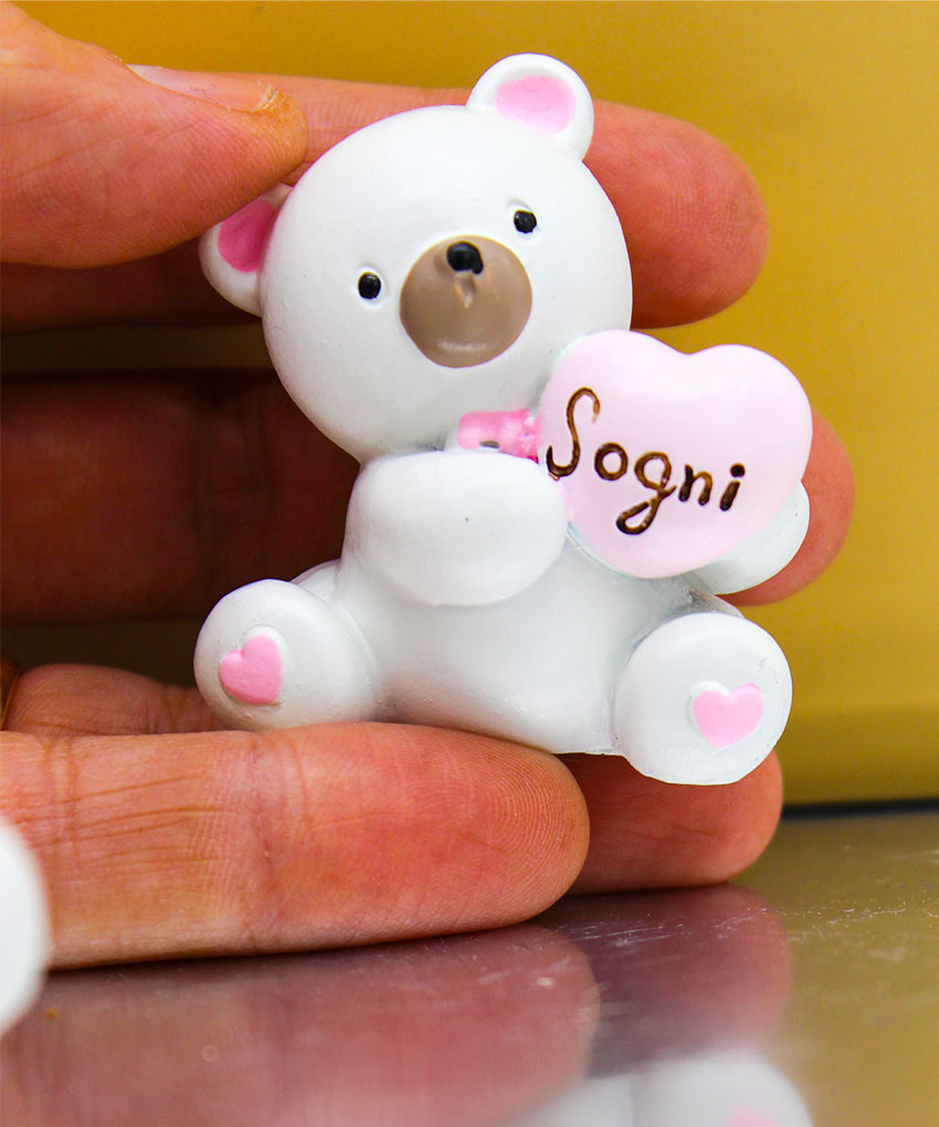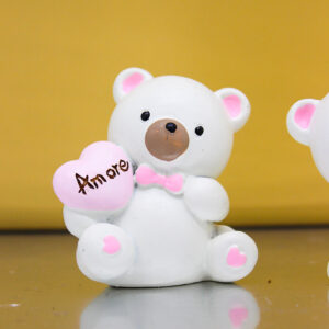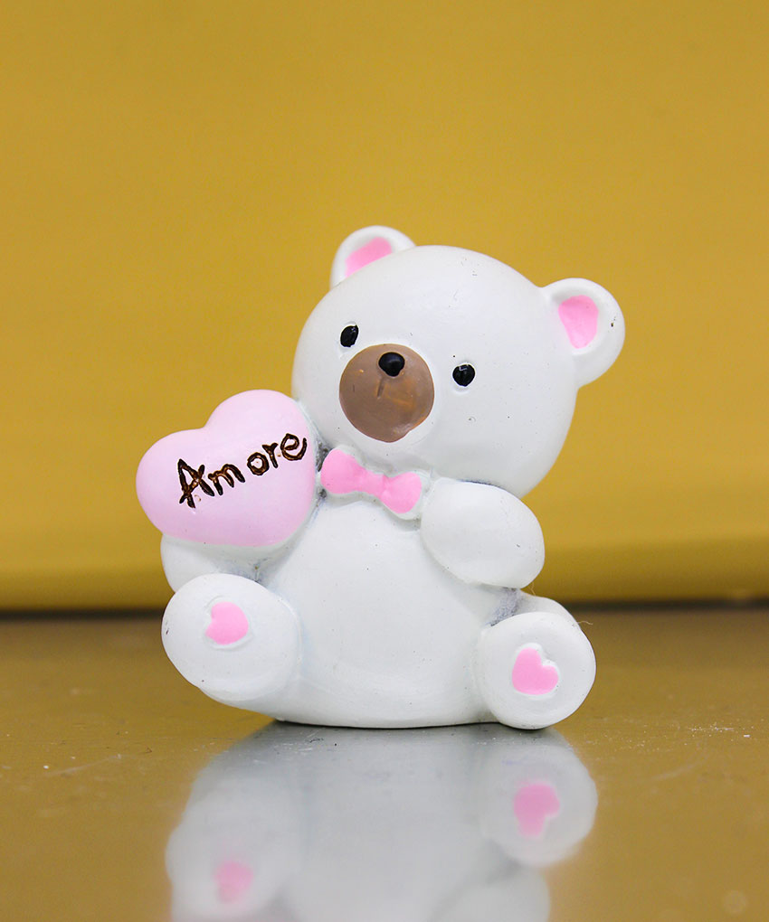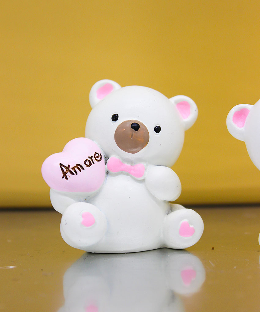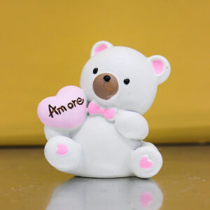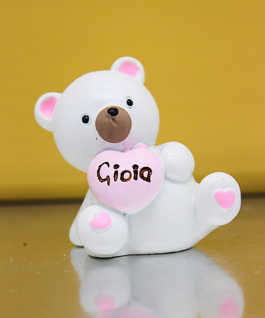 Realizzato in resina con finitura colore Rosa, questo grazioso orsetto è disponibile in 3 modelli assortiti, ciascuno decorato con un cuore e una delicata incisione con parole simboliche: