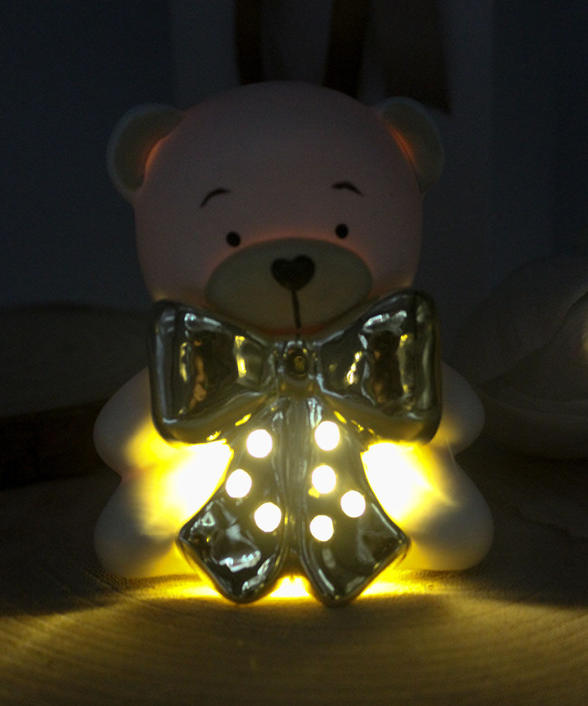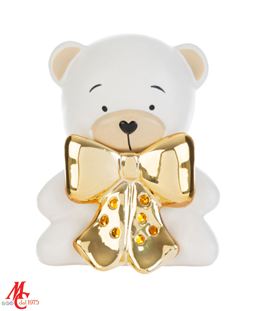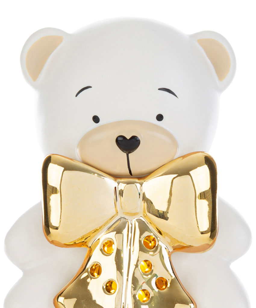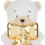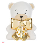 Realizzata in porcellana bianca di alta qualità, la bomboniera raffigura un tenero orsetto impreziosito da un elegante fiocco dorato in porcellana. Grazie alla luce LED integrata, crea una soffusa atmosfera di tenerezza e magia. Le sue dimensioni compatte (8 x 7 x h.9,5 cm) la rendono perfetta sia come bomboniera che come elemento decorativo per la cameretta.