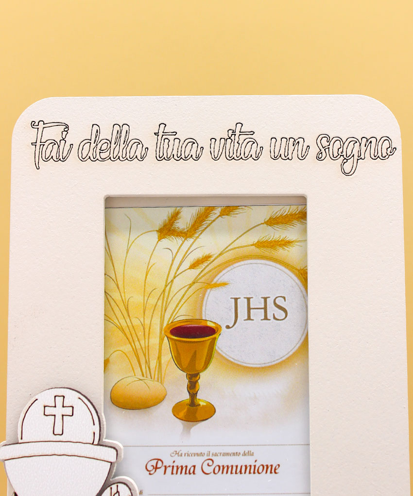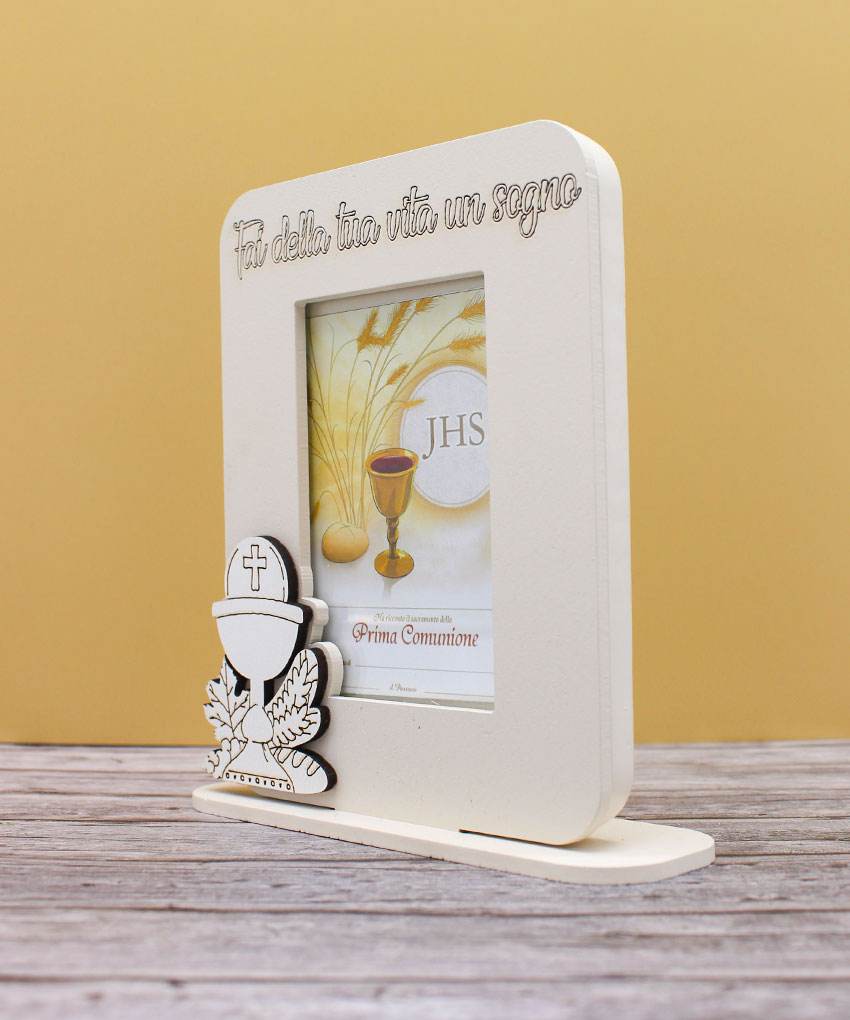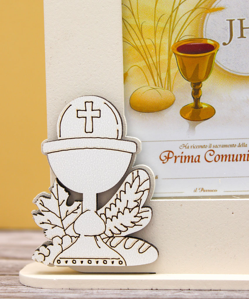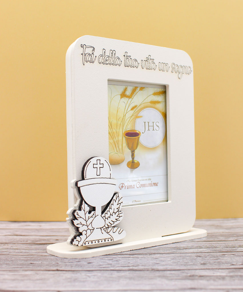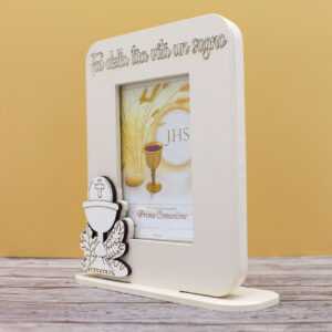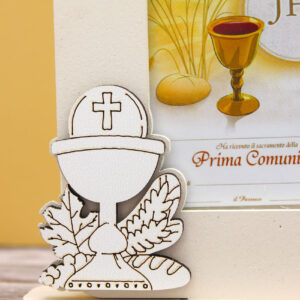 Portafoto per Comunione con calice simbolico. Bomboniera elegante e significativa, ideale come ricordo della Prima Comunione. Dimensioni 10 × 13 cm.
