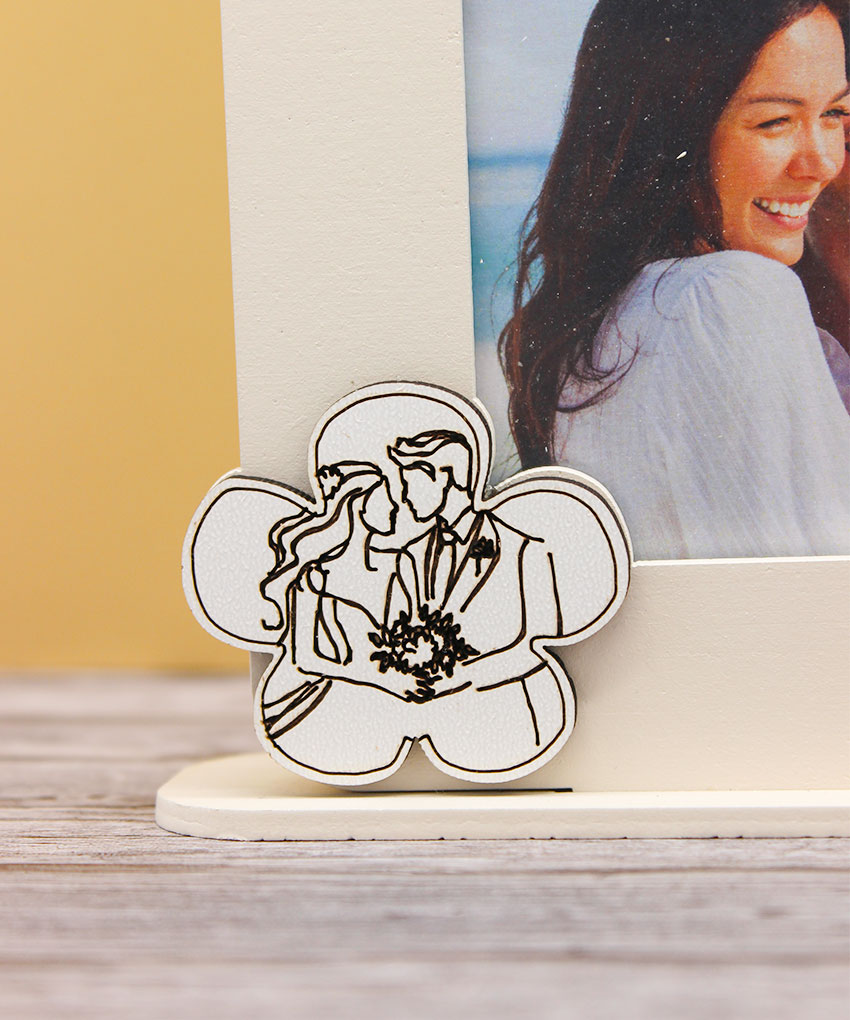 Il portafoto è impreziosito dalla delicata raffigurazione della coppia di sposi, simbolo di amore, unione e condivisione. La finitura sabbia, sobria e versatile, si adatta perfettamente a qualsiasi stile di arredamento, valorizzando sia ambienti classici che moderni.