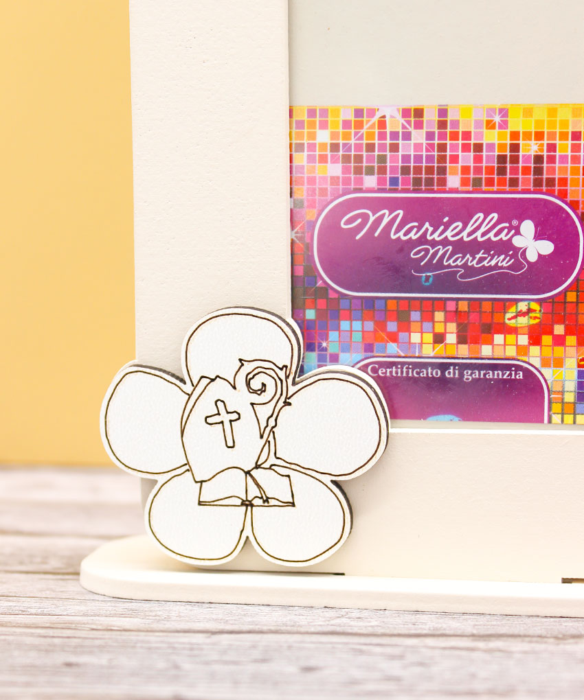 Portafoto in legno con simbolo Cresima colore sabbia. Bomboniera elegante e significativa. Dimensioni 12 × 19 cm.