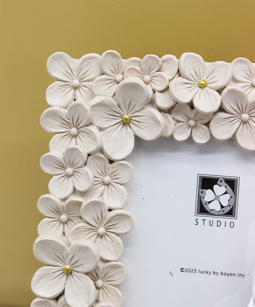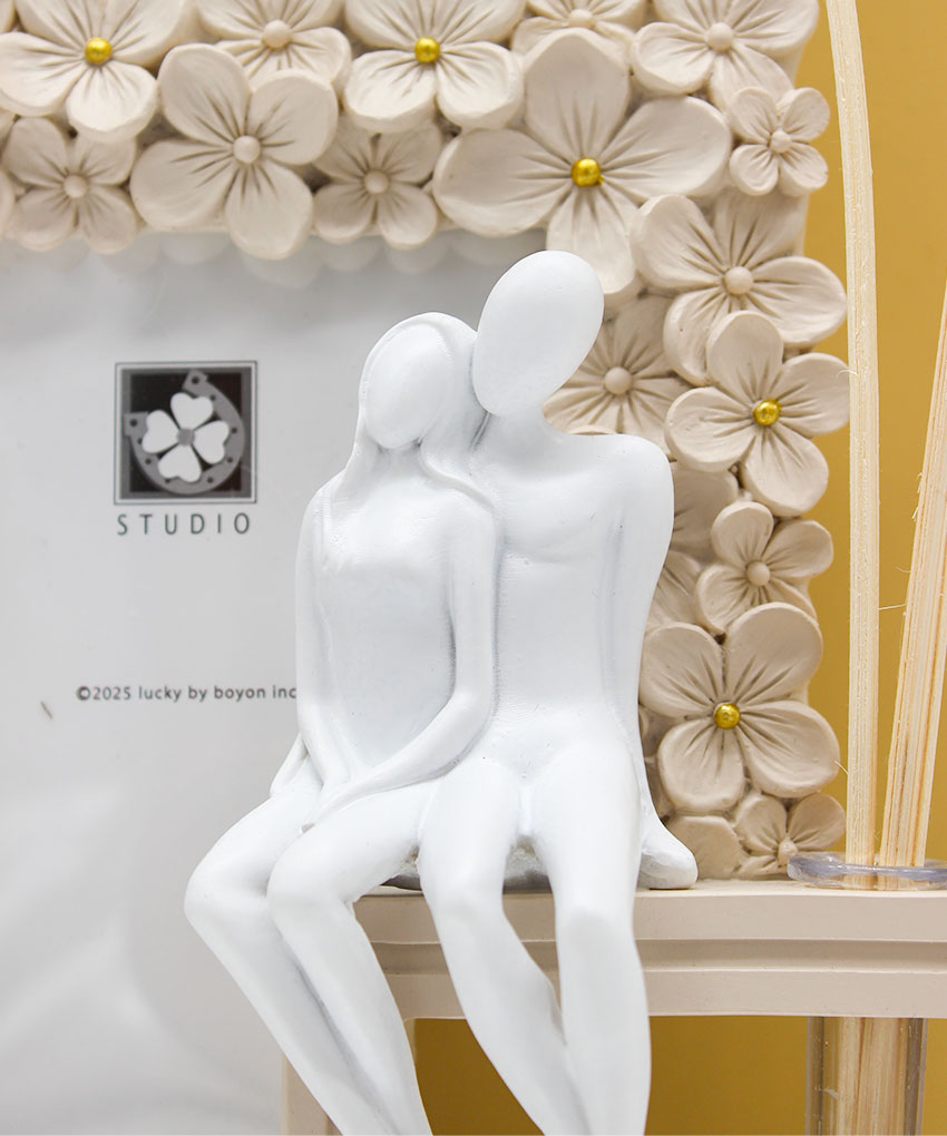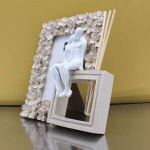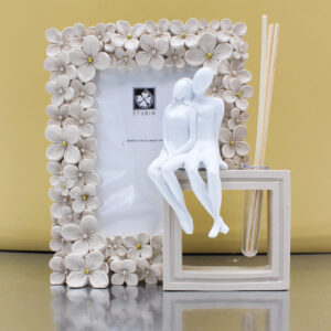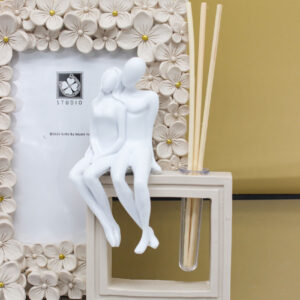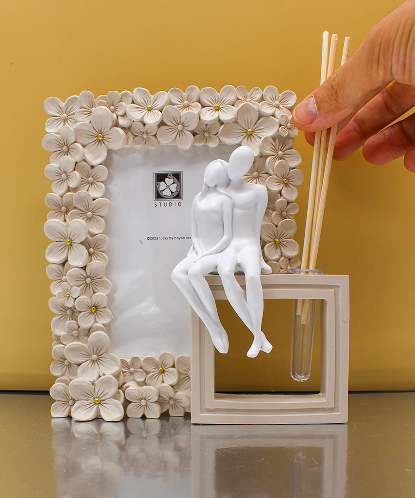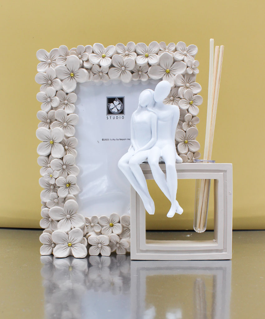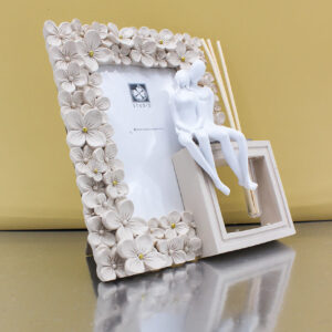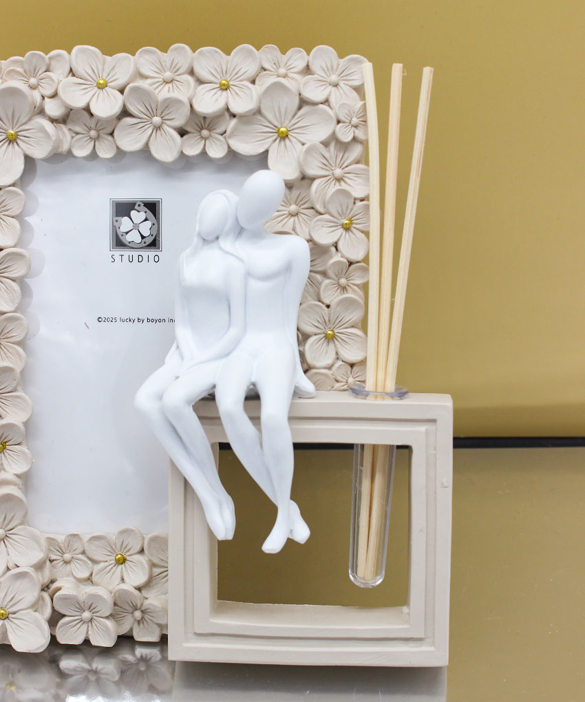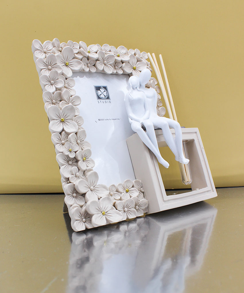 Il design delicato con fiorellini beige incornicia una dolce coppia in resina, creando un oggetto decorativo armonioso e ricco di significato. Oltre a custodire un ricordo prezioso, il portafoto è dotato di funzione profumatore, ideale per donare una piacevole fragranza agli ambienti.