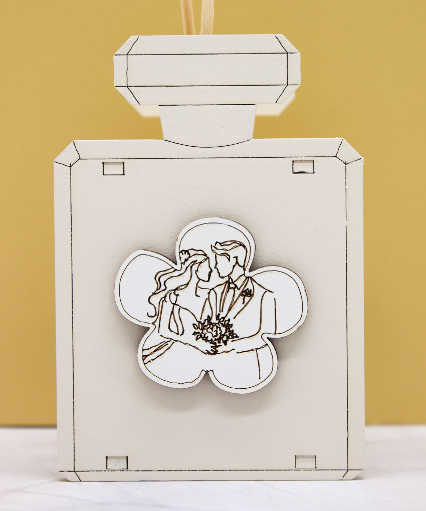 La Bomboniera Profumatore a forma di bottiglia con simbolo coppia sposi, realizzata in elegante colore sabbia, è una scelta raffinata e romantica per celebrare matrimoni e anniversari con un oggetto utile e dal forte valore simbolico.