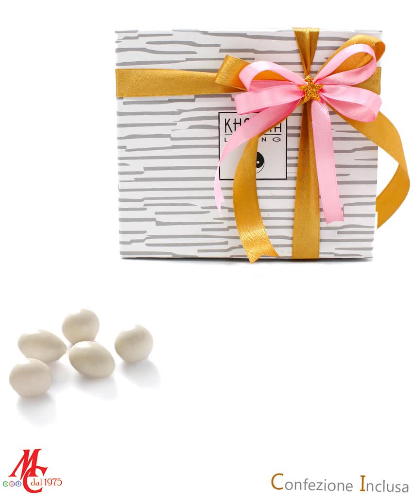 - 5 confetti Bianchi al Cioccolato inseriti in tulle con nastrino di raso ( stesso colore confezione esterna)