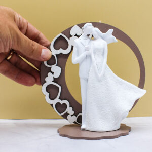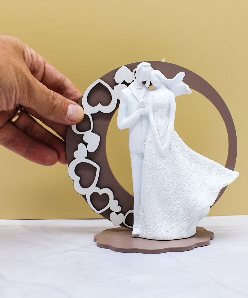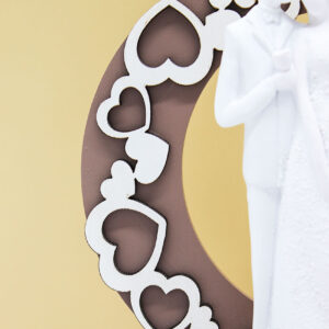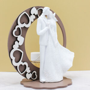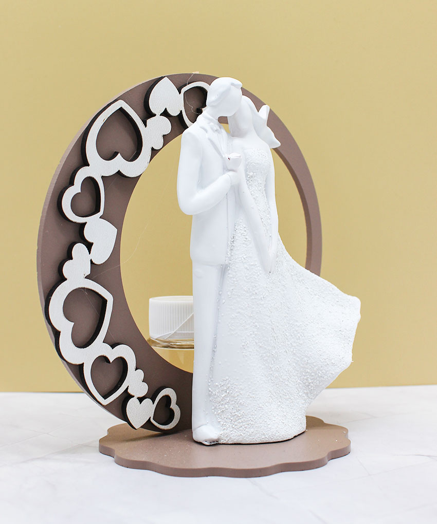 Bomboniera Profumatore Coppia Sposi con Arco in Legno Intagliato e Cuori colore Fango – 14 × 15 cm