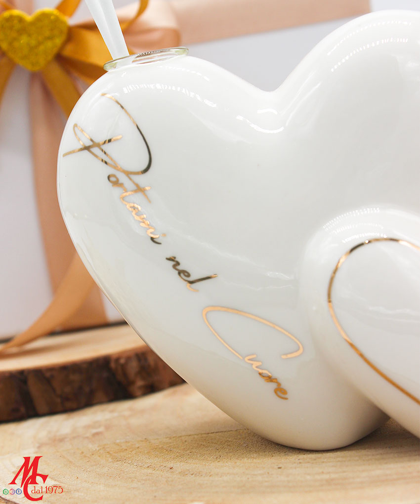 Un’idea regalo raffinata e profumata per celebrare momenti speciali. Questo elegante Bomboniera profumatore per ambiente a forma di cuore in porcellana bianca, misura 13,5 x 7 x 11 cm ed è impreziosito dalla scritta dorata “Portami nel Cuore”, un messaggio dolce e simbolico perfetto per emozionare chi lo riceve.
