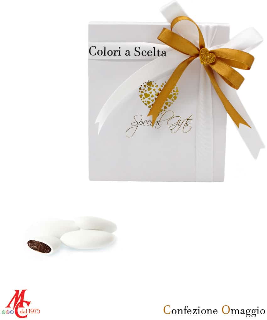 • 5 confetti Bianchi al Cioccolato inseriti in tulle con nastrino di raso ( stesso colore confezione esterna)