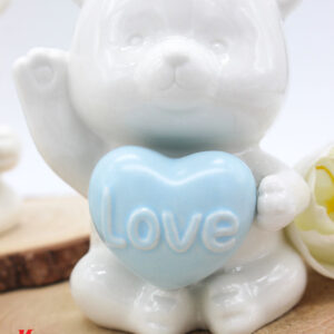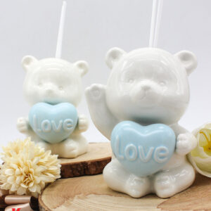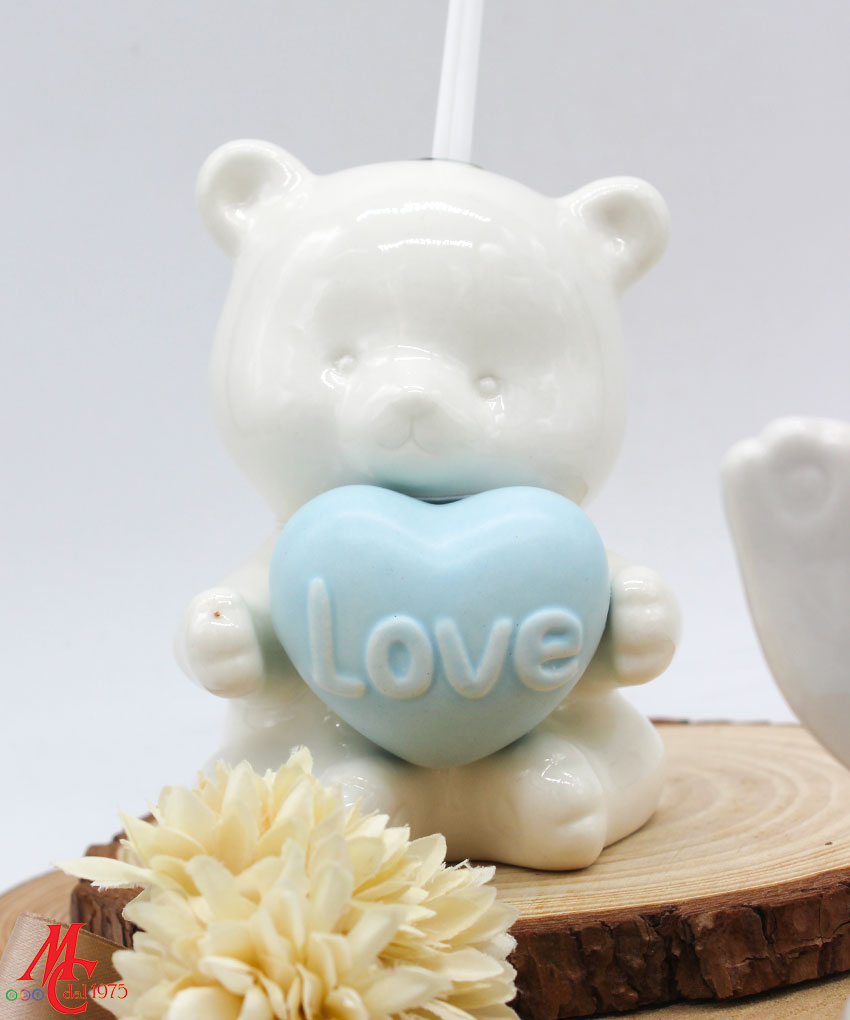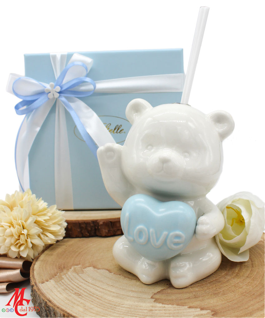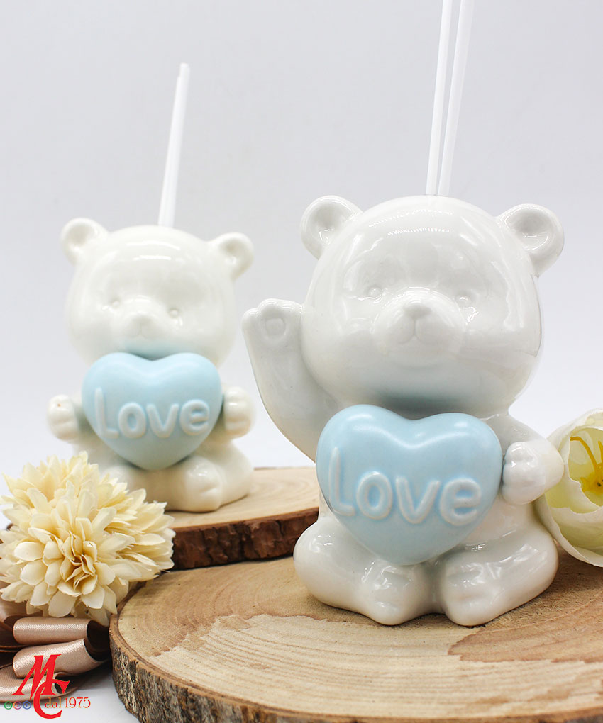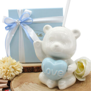 Un profumatore raffinato e tenero allo stesso tempo, pensato per trasformare ogni ambiente in un angolo dolce e accogliente. Realizzato in porcellana celeste, raffigura un orsetto con cuore disponibile in due posizioni assortite. Con le sue dimensioni di 9,5x9xh.13 cm, rappresenta la bomboniera perfetta per nascite e battesimi, aggiungendo un tocco di eleganza e affetto.