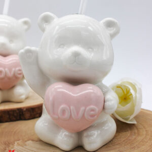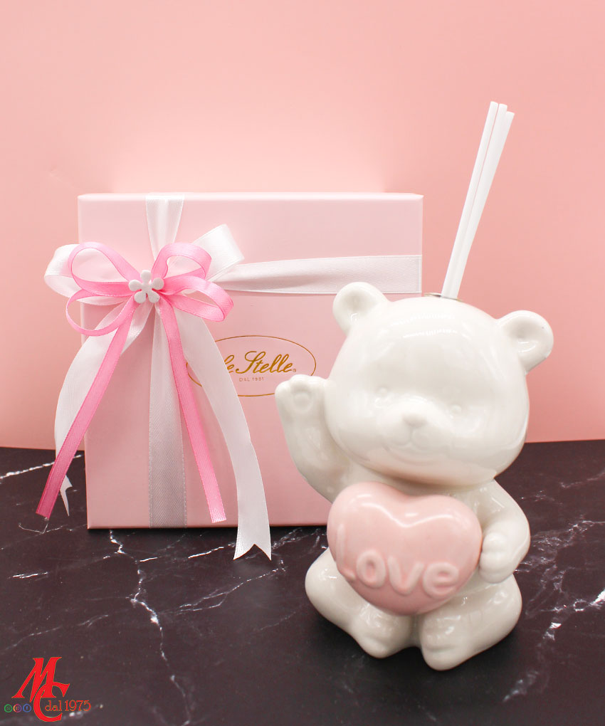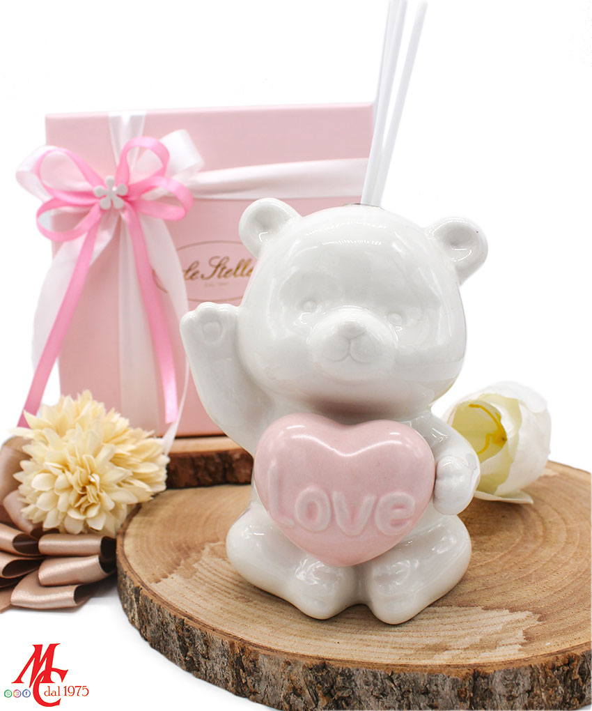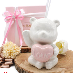 Un profumatore raffinato e tenero allo stesso tempo, pensato per trasformare ogni ambiente in un angolo dolce e accogliente. Realizzato in porcellana Rosa, raffigura un orsetto con cuore disponibile in due posizioni assortite. Con le sue dimensioni di 9,5x9xh.13 cm, rappresenta la bomboniera perfetta per nascite e battesimi, aggiungendo un tocco di eleganza e affetto.