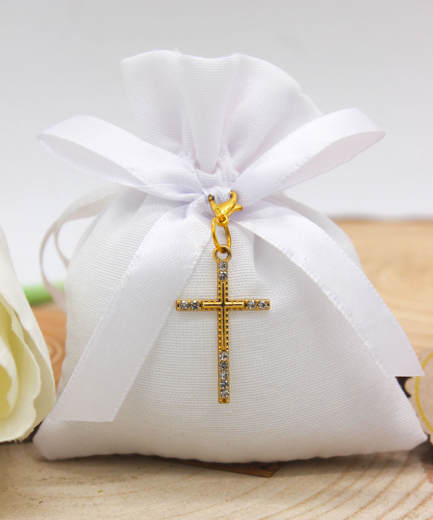 Dimensioni: 10 cm x 12 cm – Colore sacchetto: Bianco – Materiale: Tessuto – Nastrini: Doppio raso bianco – Charm: Crocetta color oro con strass – Confetti: 5 confetti al cioccolato (inclusi) – Confezione: Inclusa