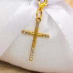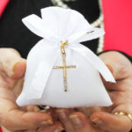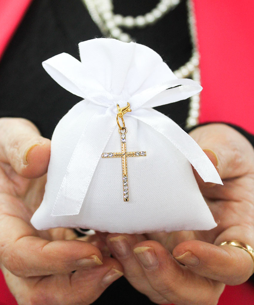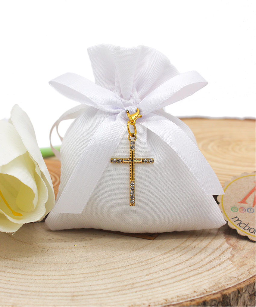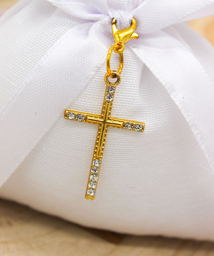 Il sacchetto, realizzato in tessuto bianco di alta qualità, è arricchito da nastrini in doppio raso bianco che donano un tocco di eleganza classica e senza tempo. Il protagonista del decoro è il raffinato charm a forma di crocetta color oro, impreziosito da luminosi strass, che simboleggia spiritualità e protezione.
