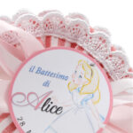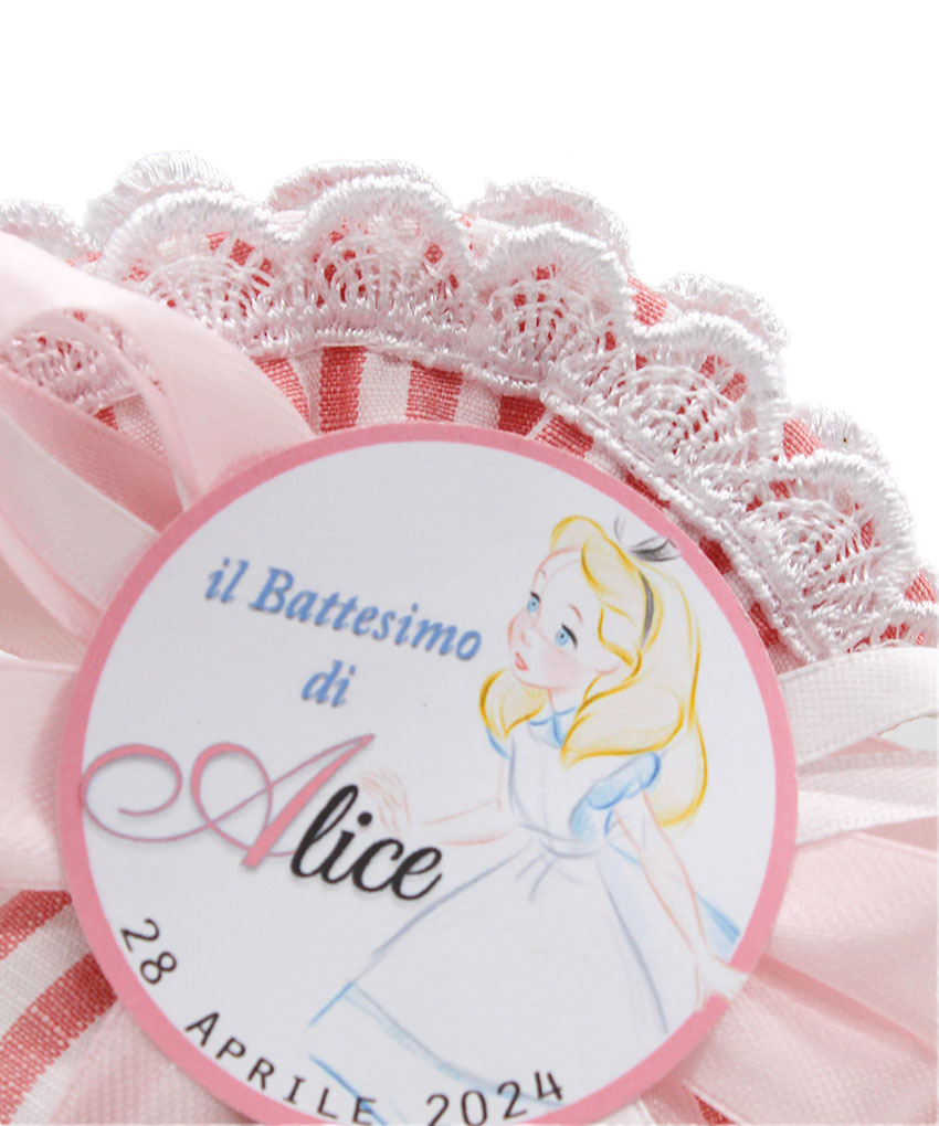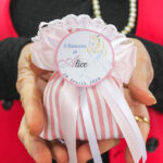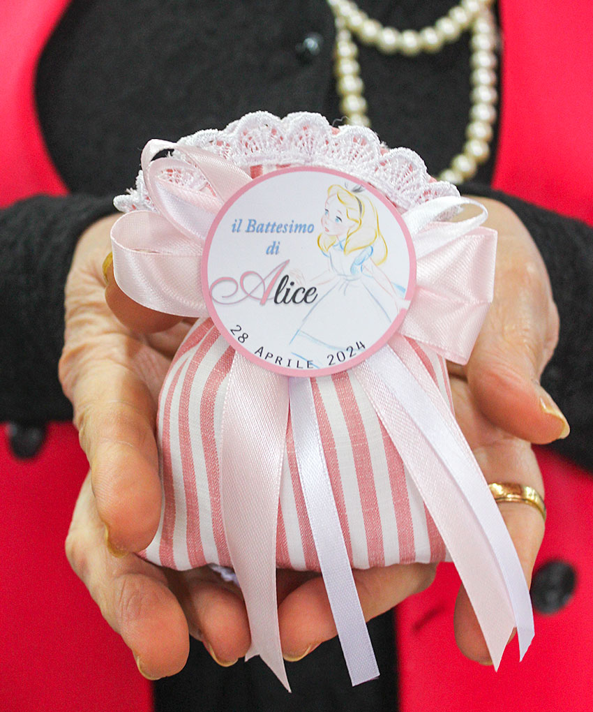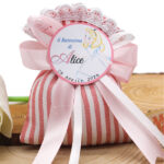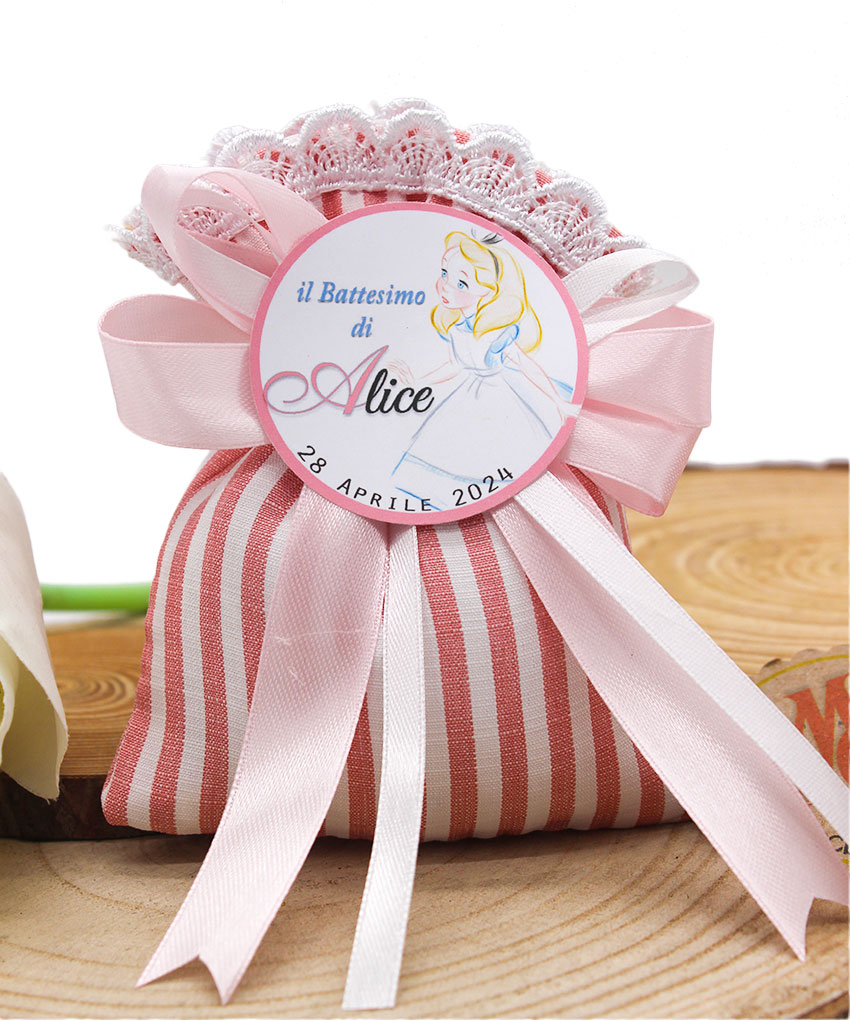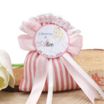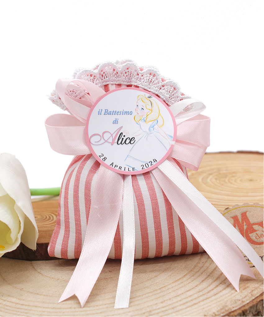 Dimensioni: 10 cm x 12 cm – Materiale: Tessuto a strisce bianco e rosa con bordino in pizzo bianco – Nastrini: Doppio raso (colori a scelta) – Confetti: 5 confetti al cioccolato inclusi – Tag: Non incluso (acquistabile a parte e personalizzabile)