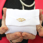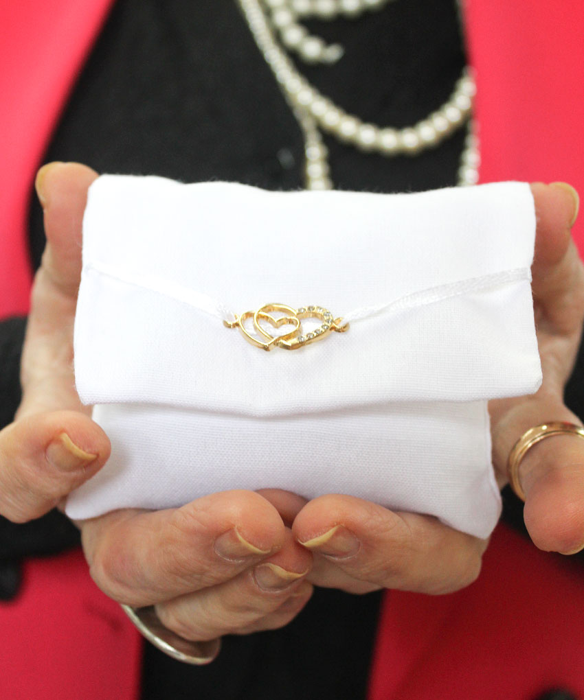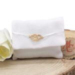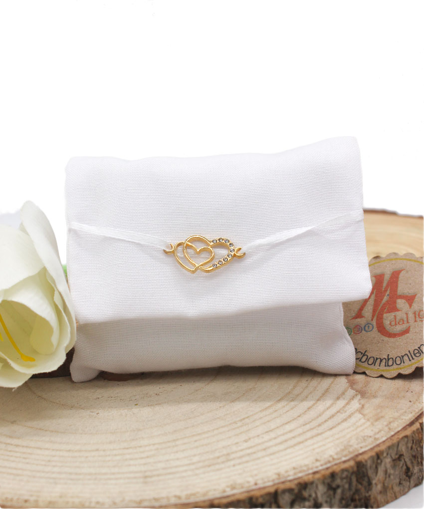 Forma: Borsetta – Materiale: Tessuto bianco – Applicazione: Charm con cuori intrecciati color oro e strass – Confetti: 5 confetti al cioccolato inclusi – Misure: 10,5 cm – Confezione: Inclusa nel prezzo
