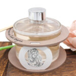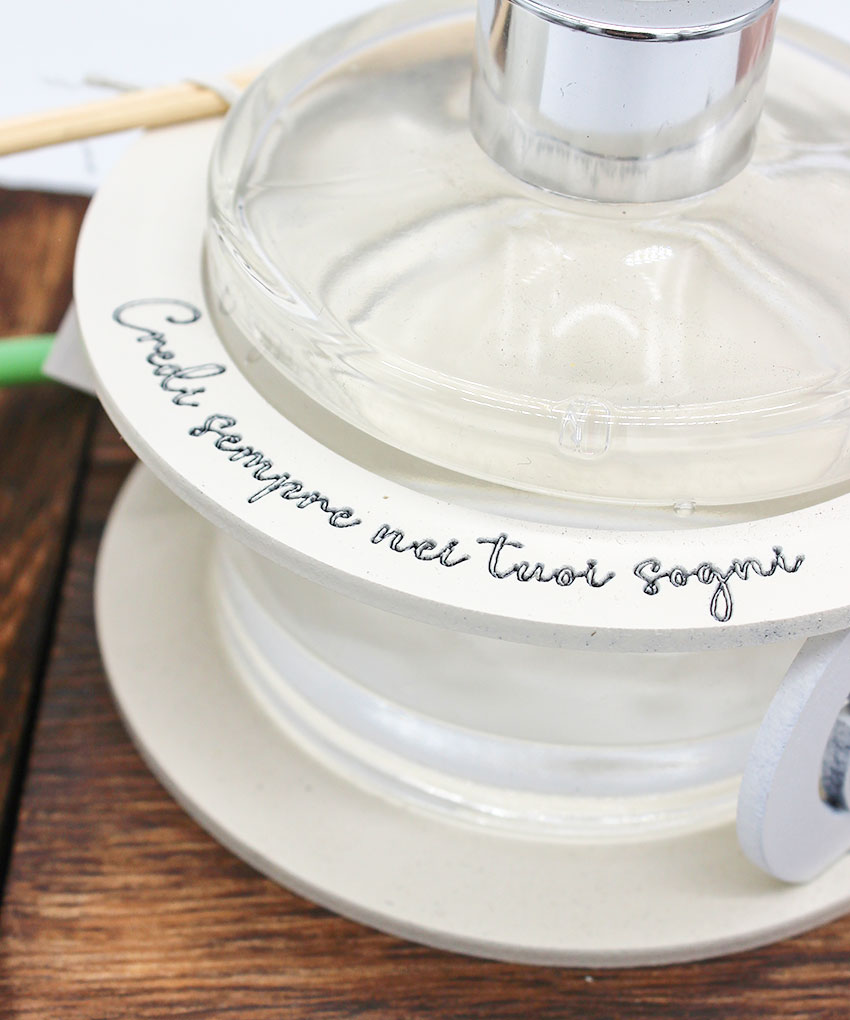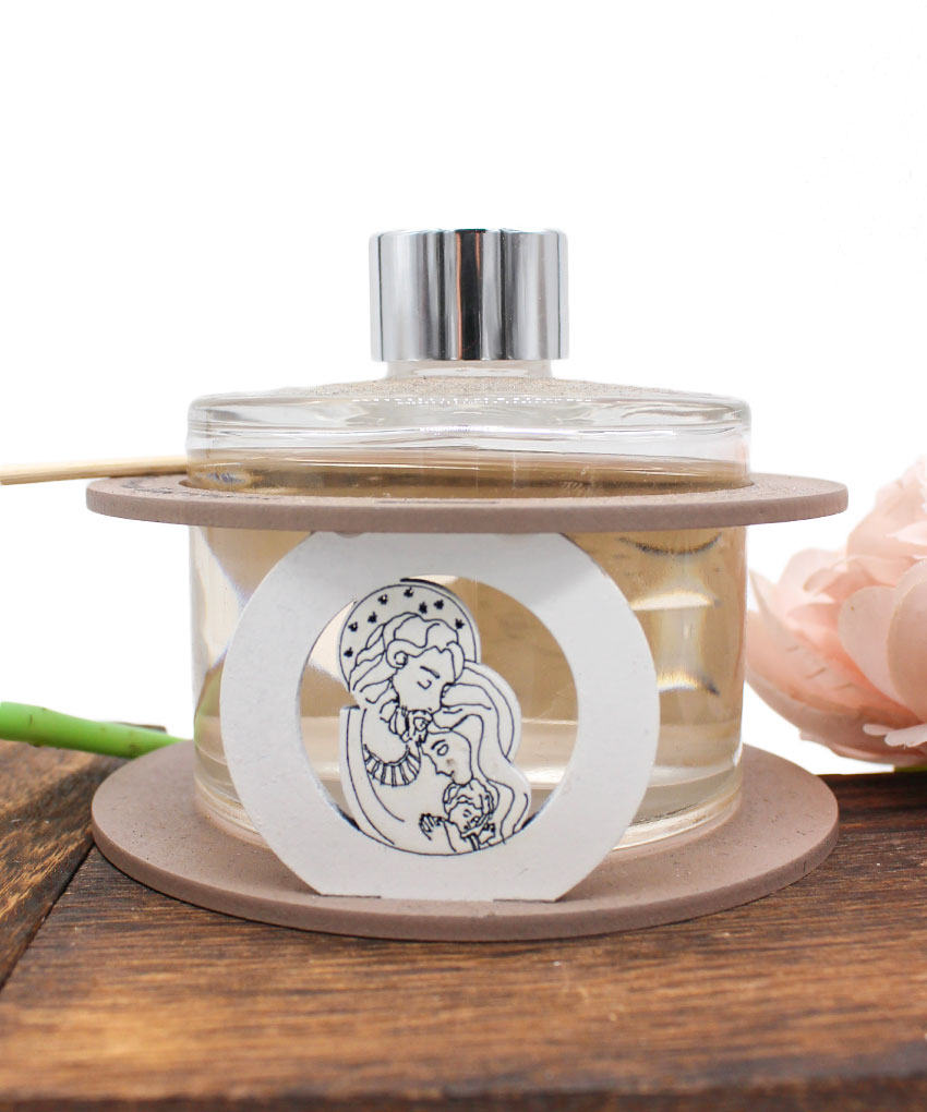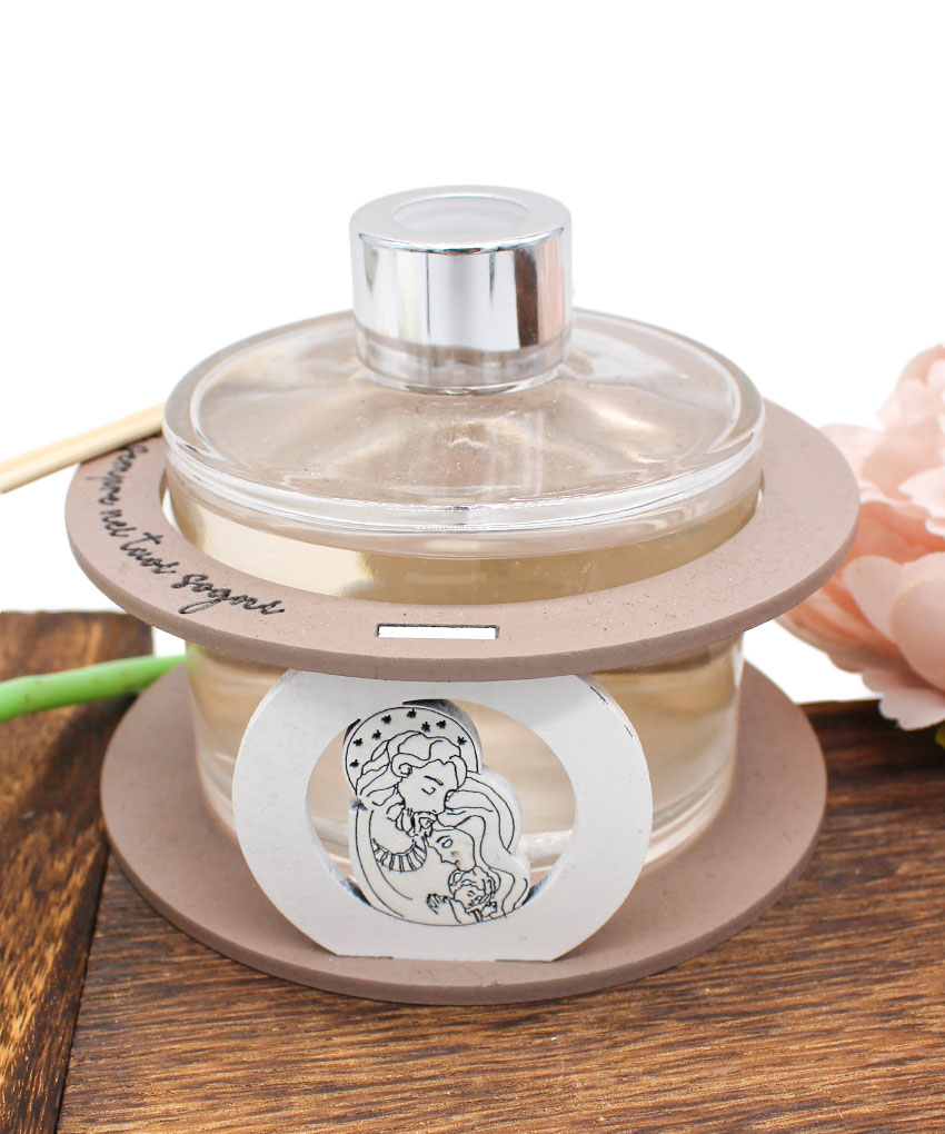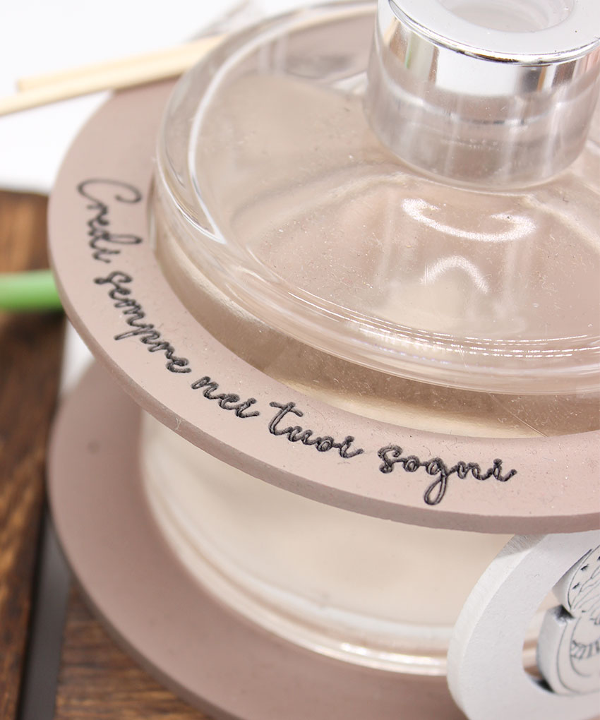 Materiale: Legno e Vetro| Colore: Beige o Tortora | Misure: 11,5cm x 9cm |Tipologia: Profumatore d’ambiente | Utilizzo: Bomboniera per ogni evento | Materiale: Legno intagliato al laser + boccia in vetro