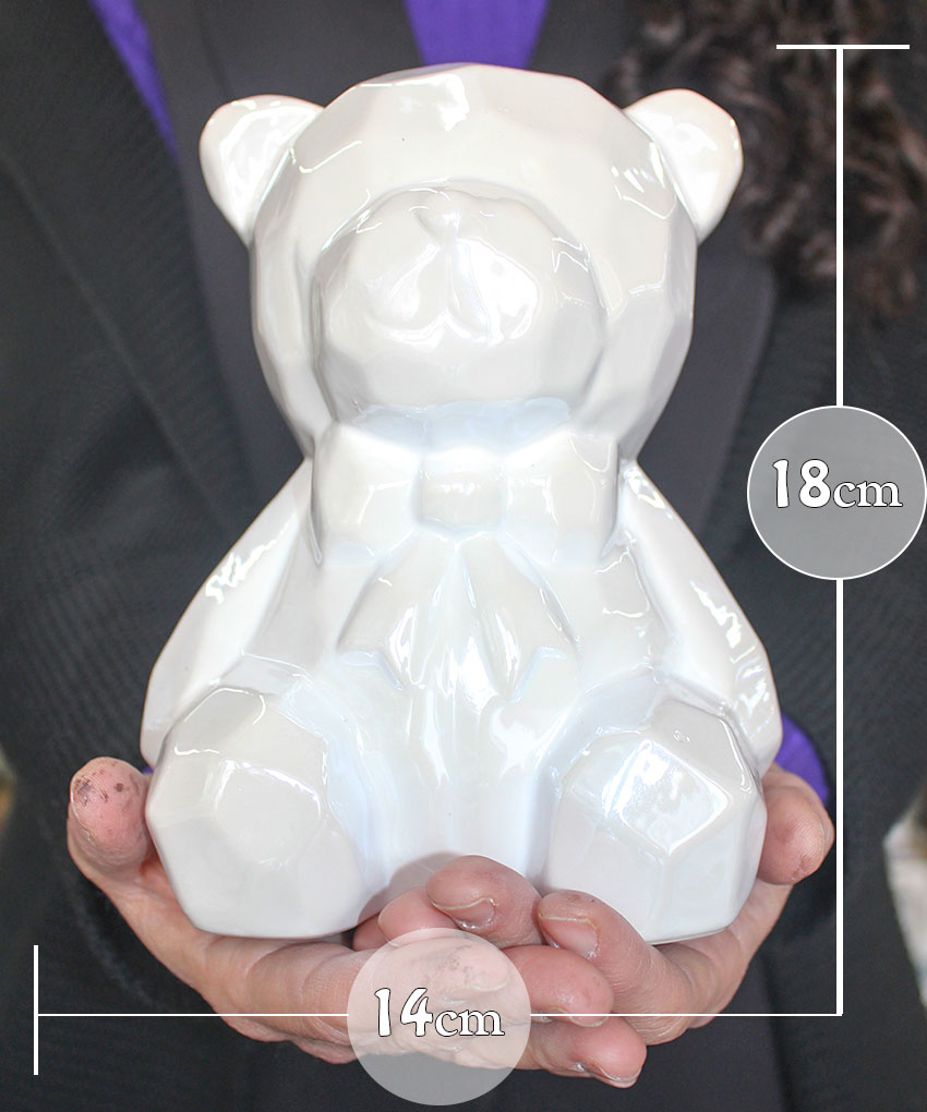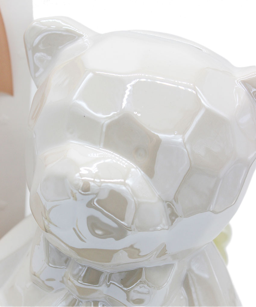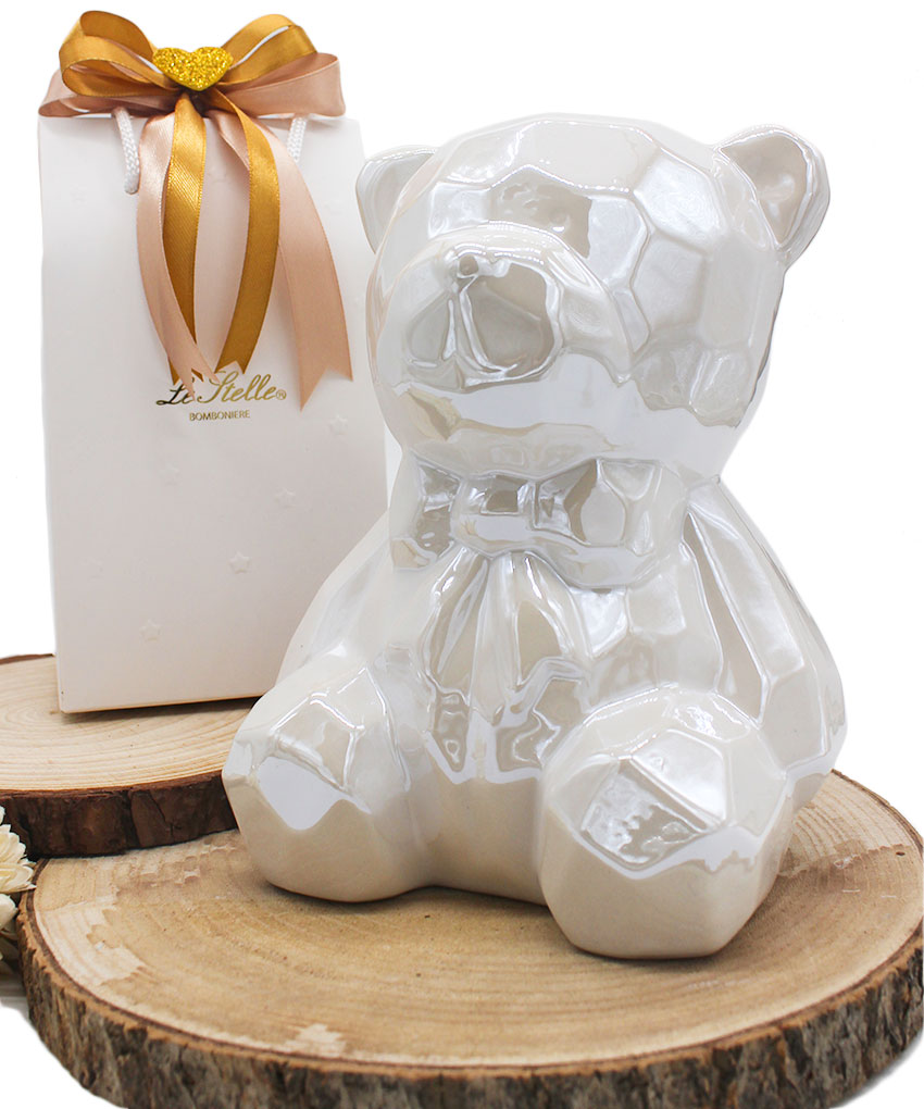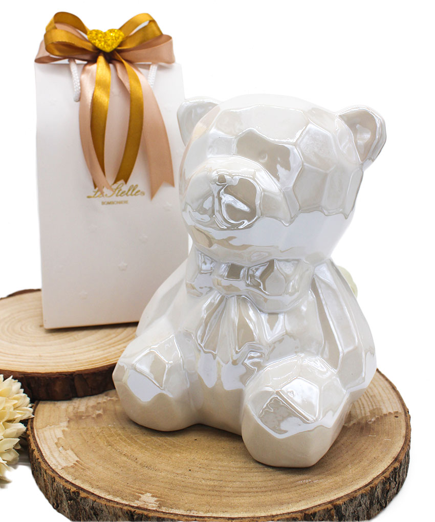 Un dolcissimo salvadanaio a forma di orsetto, in porcellana Bianco perlato, pensato per rendere indimenticabili le tue cerimonie. Grazie al suo design tenero e alle dimensioni generose (14x13xh.18 cm), questa bomboniera è perfetta per il battesimo o la nascita di una bambina.