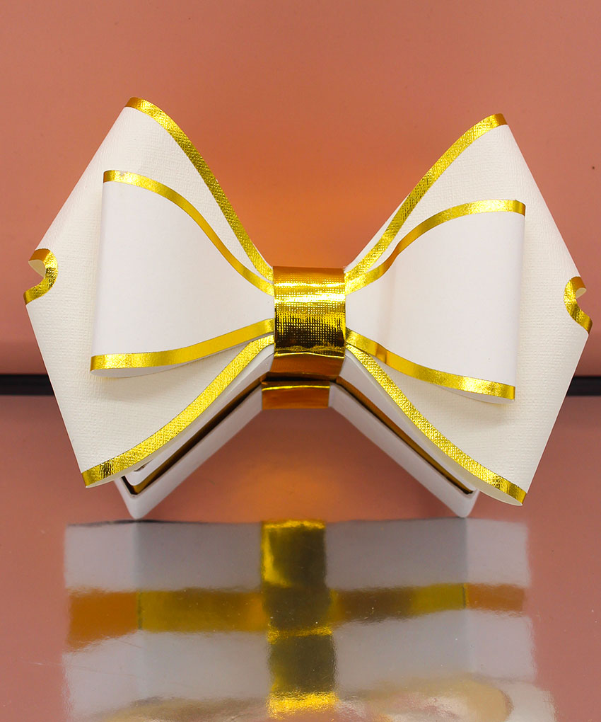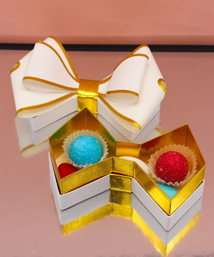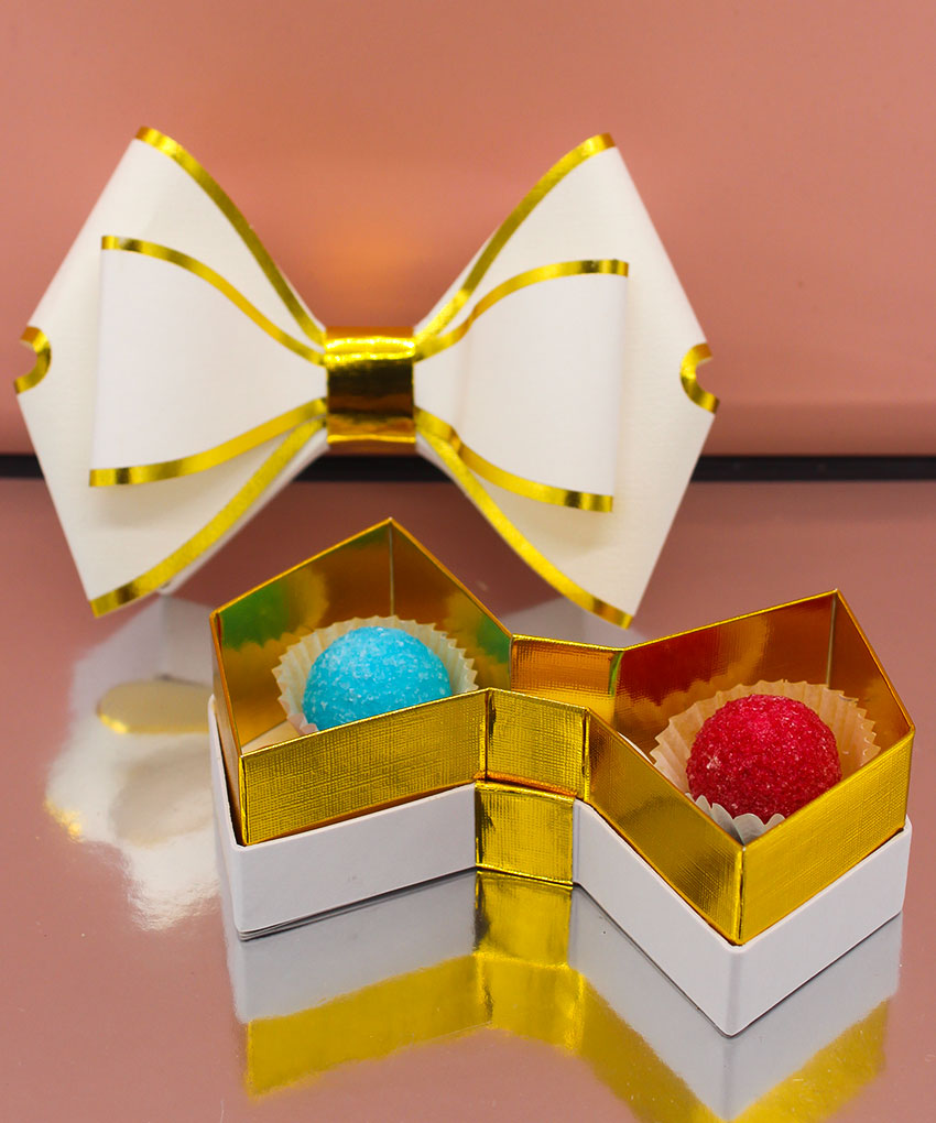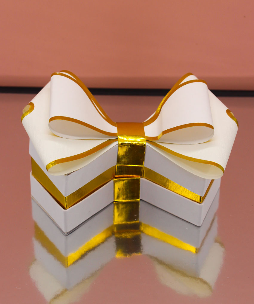 Bomboniera scatola degustazione a forma di fiocco Bianca, disponibile in vari colori. Acquistabile con o senza confetti. Perfetta per ogni evento speciale.