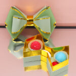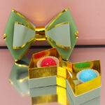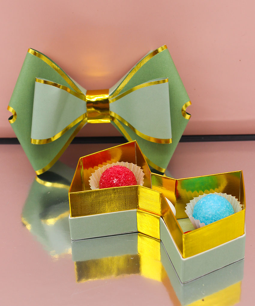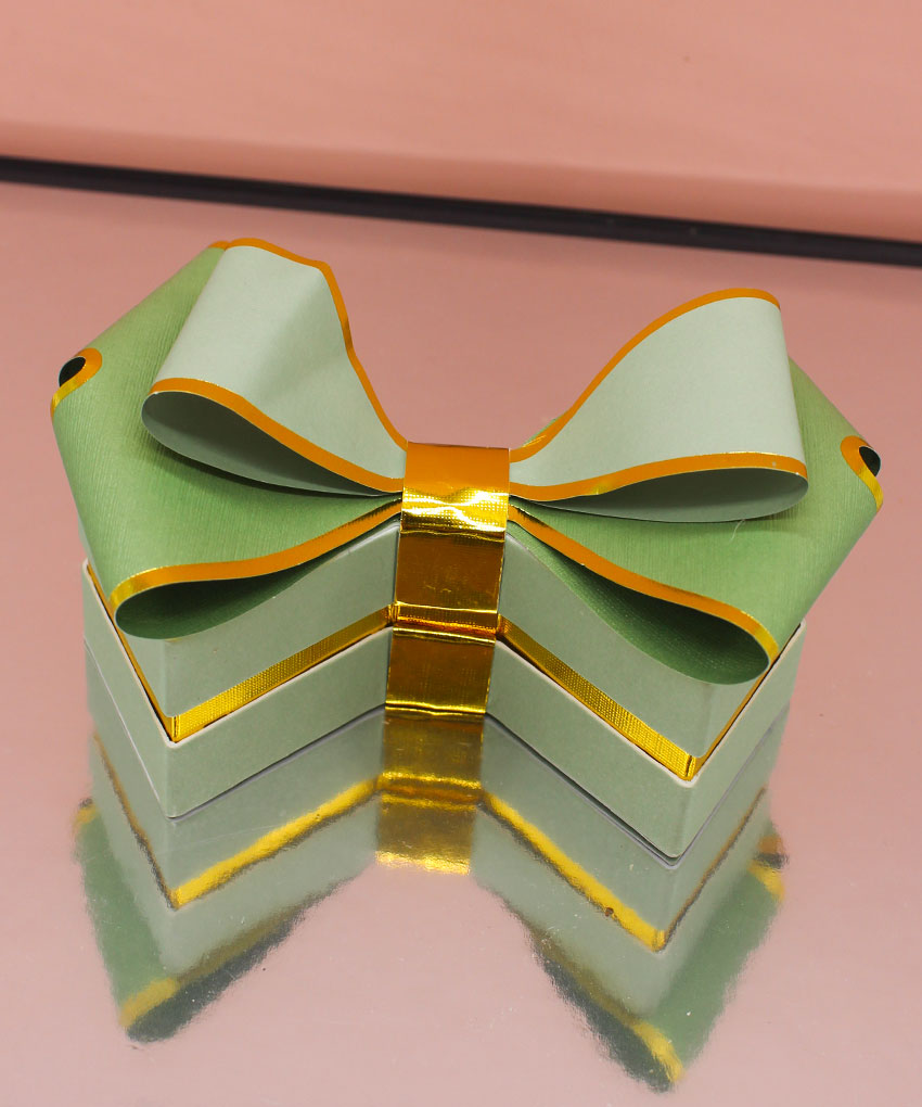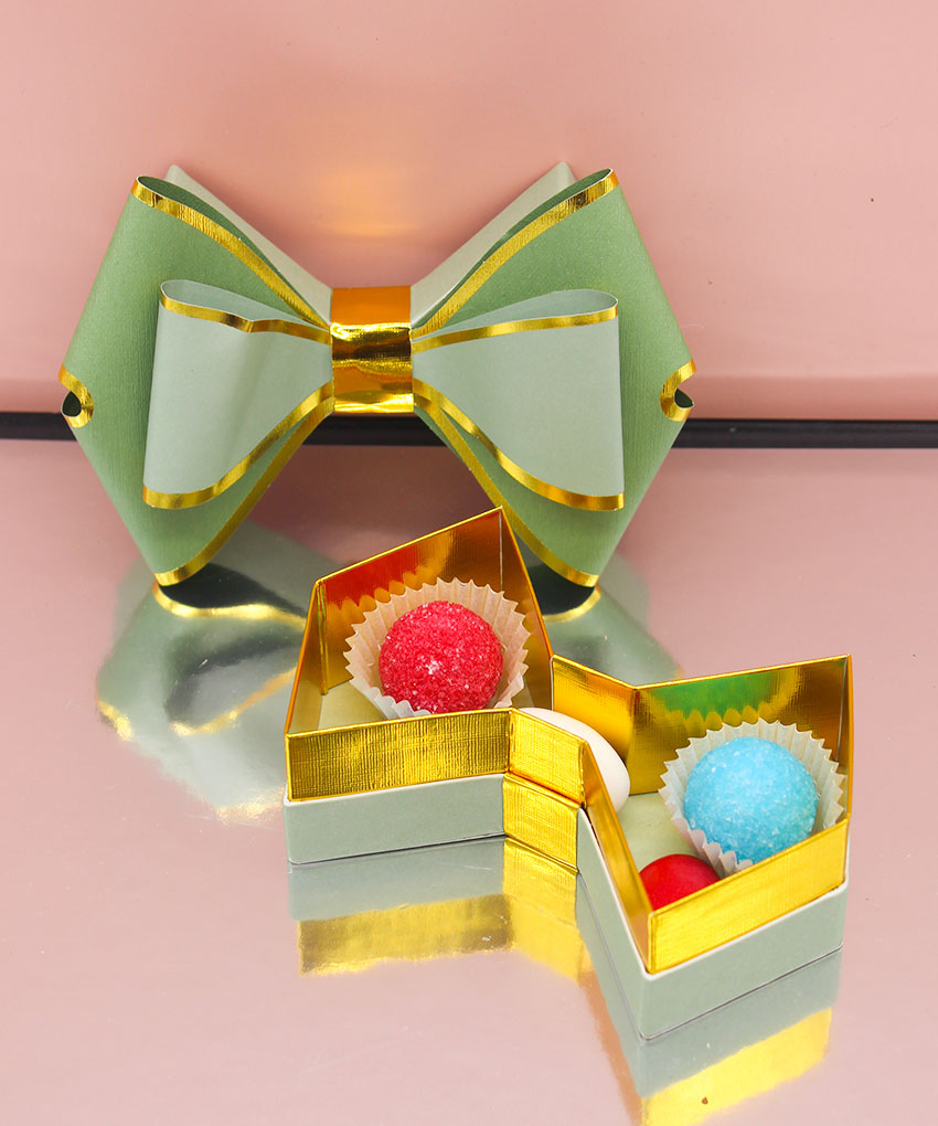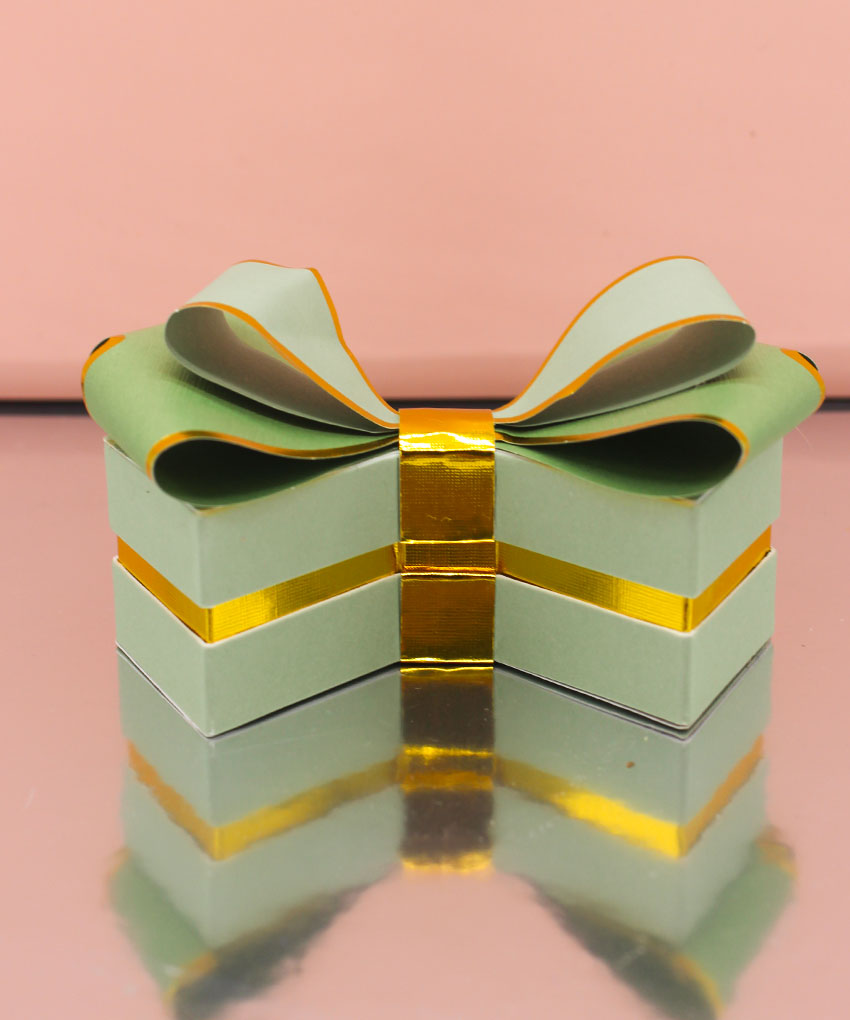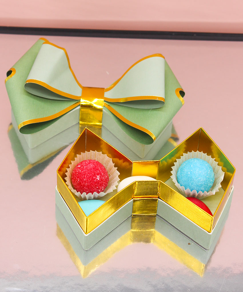 Bomboniera scatola degustazione a forma di fiocco Verde, disponibile in vari colori. Acquistabile con o senza confetti. Perfetta per ogni evento speciale.