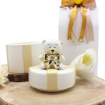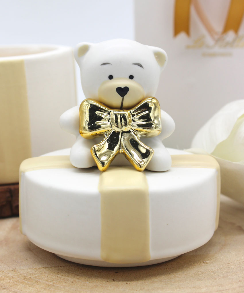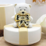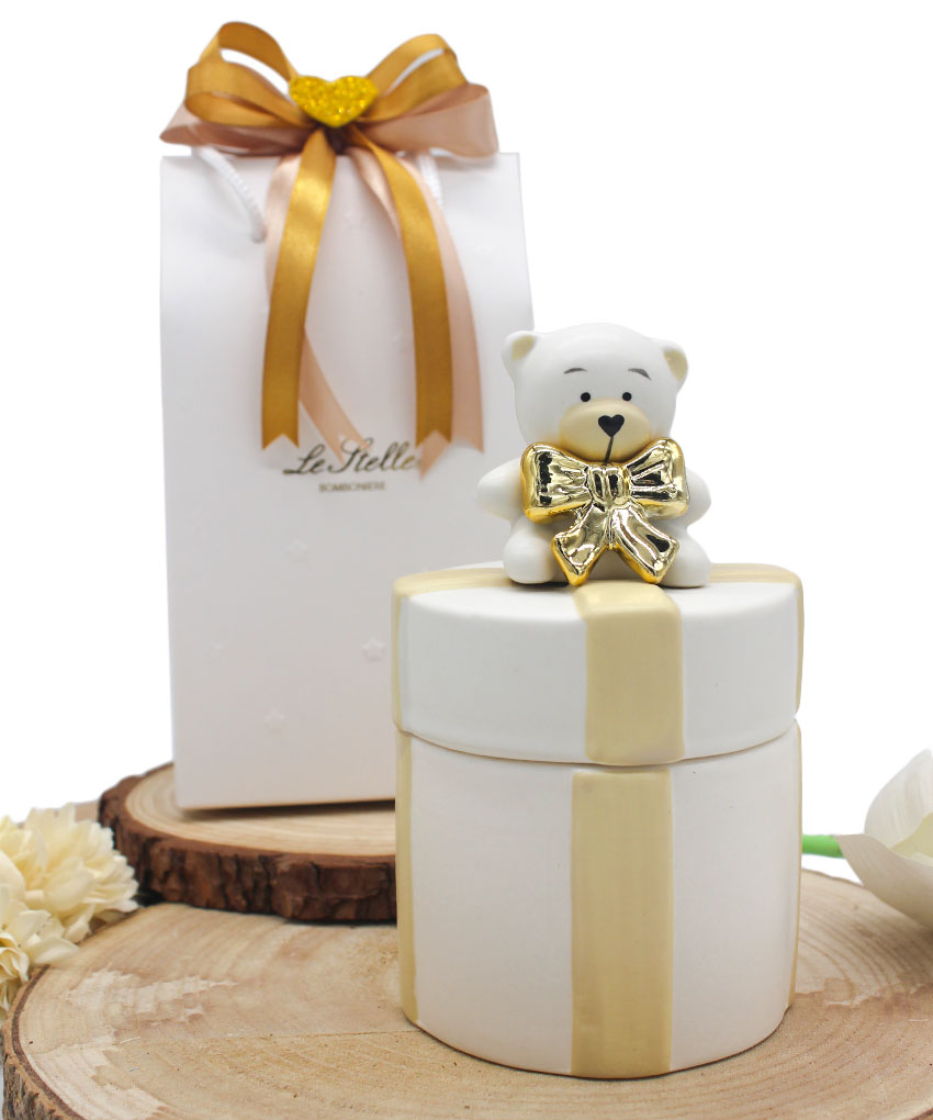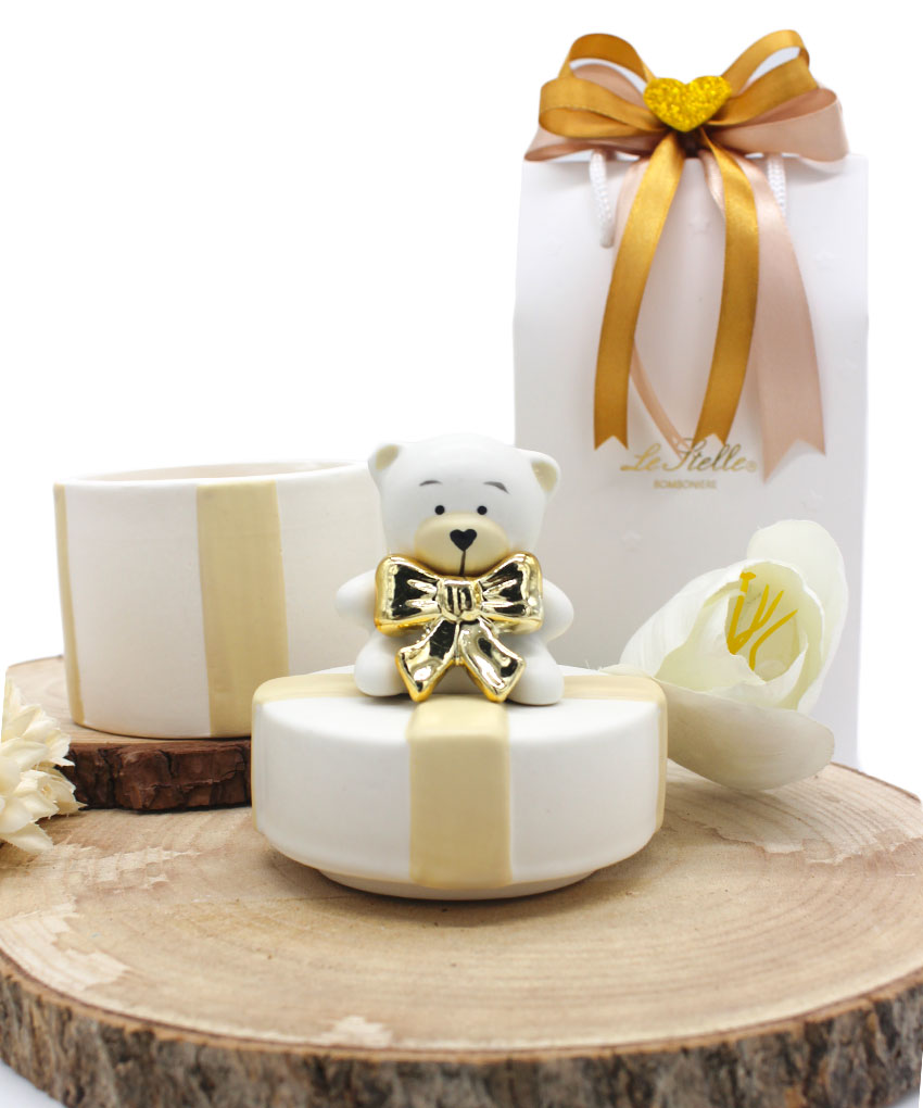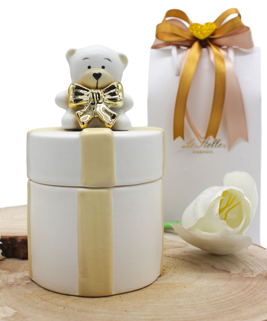 Bomboniera Scatola Orsetto in Porcellana Bianca con Fiocco Oro – Confezione Omaggio Inclusa