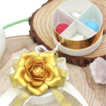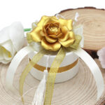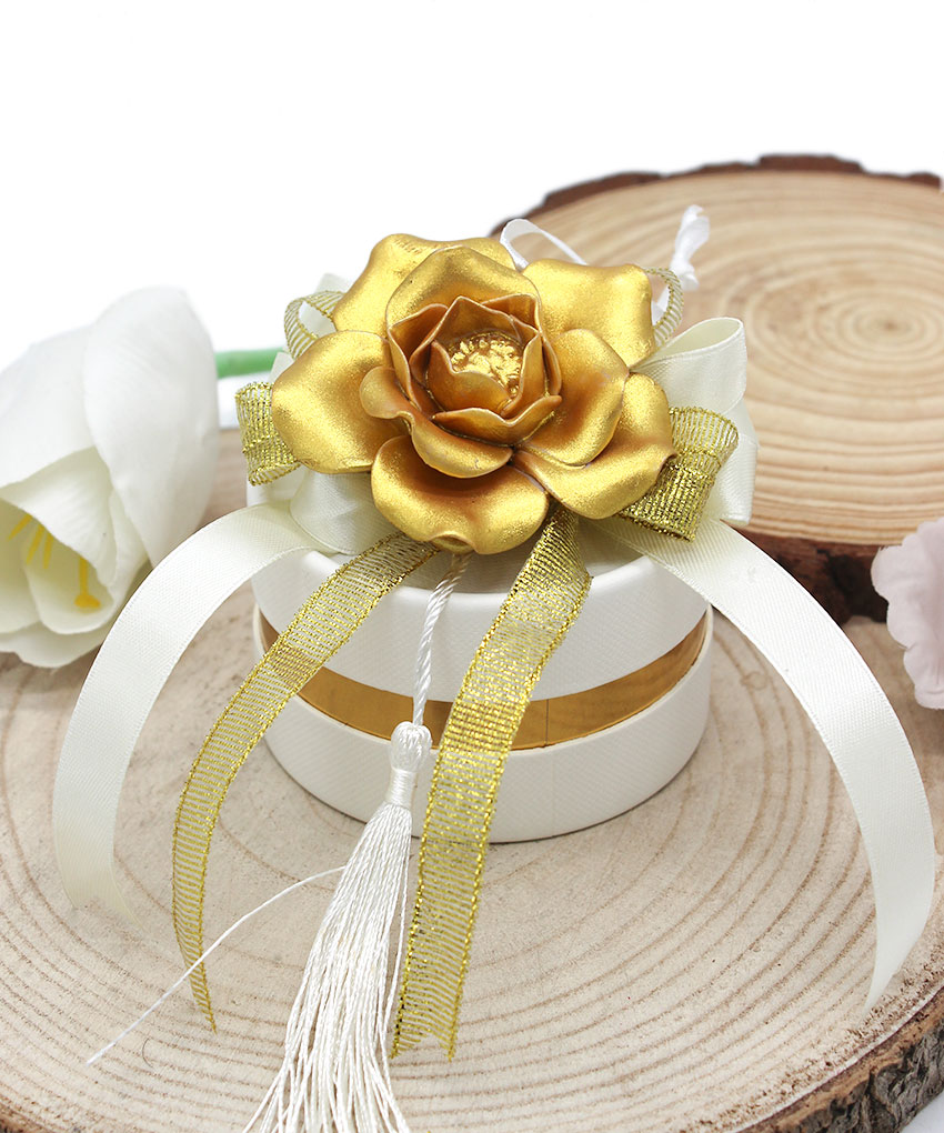Il tocco distintivo è dato dal fiore in porcellana color oro posizionato sulla parte superiore, simbolo di purezza e valore, che rende ogni bomboniera un piccolo capolavoro. I nastrini in raso bianco e oro con nappina bianca aggiungono eleganza e movimento, esaltando il confezionamento già pronto all’uso.