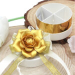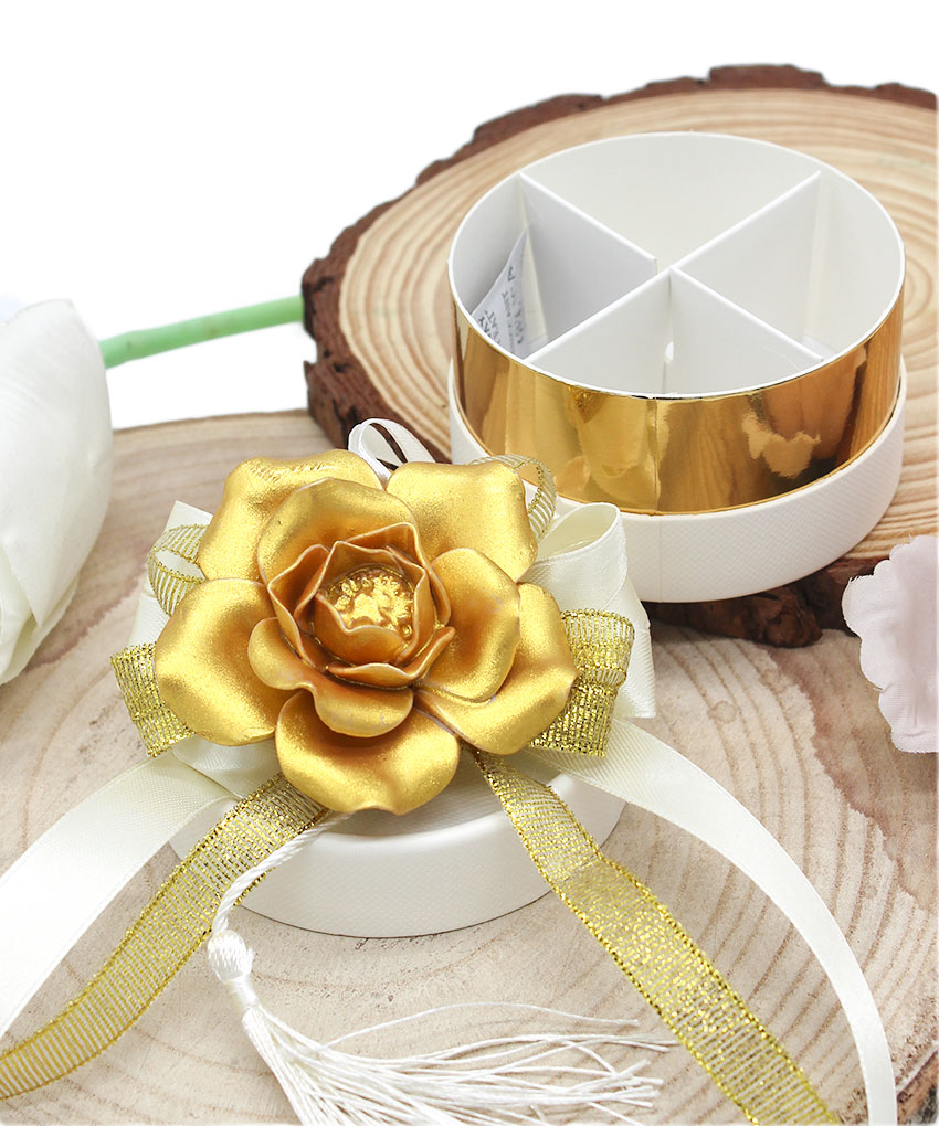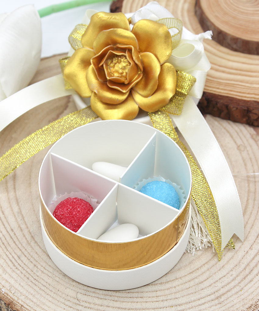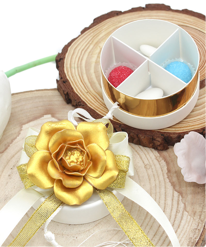Bomboniera Scatolina Degustazione Cilindrica con Fiore in Porcellana Oro e Nastrini
