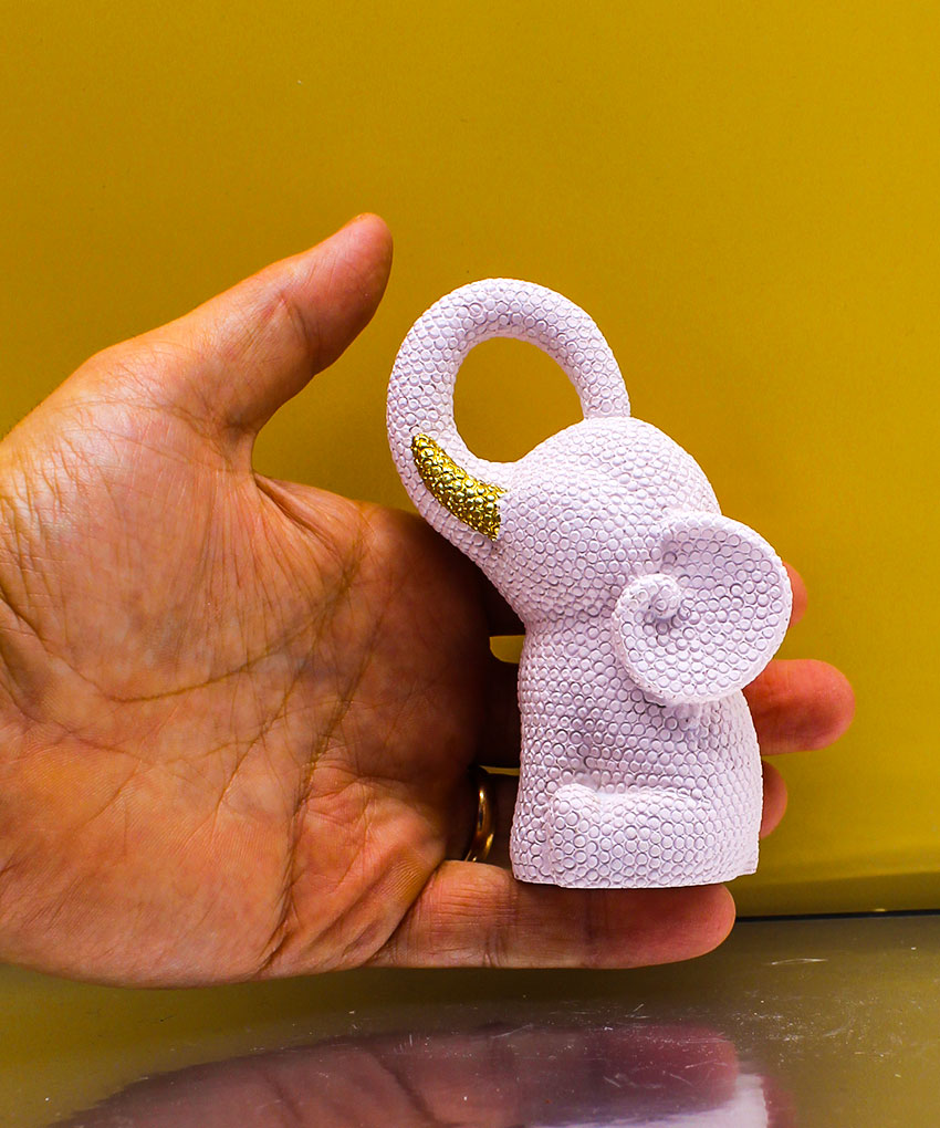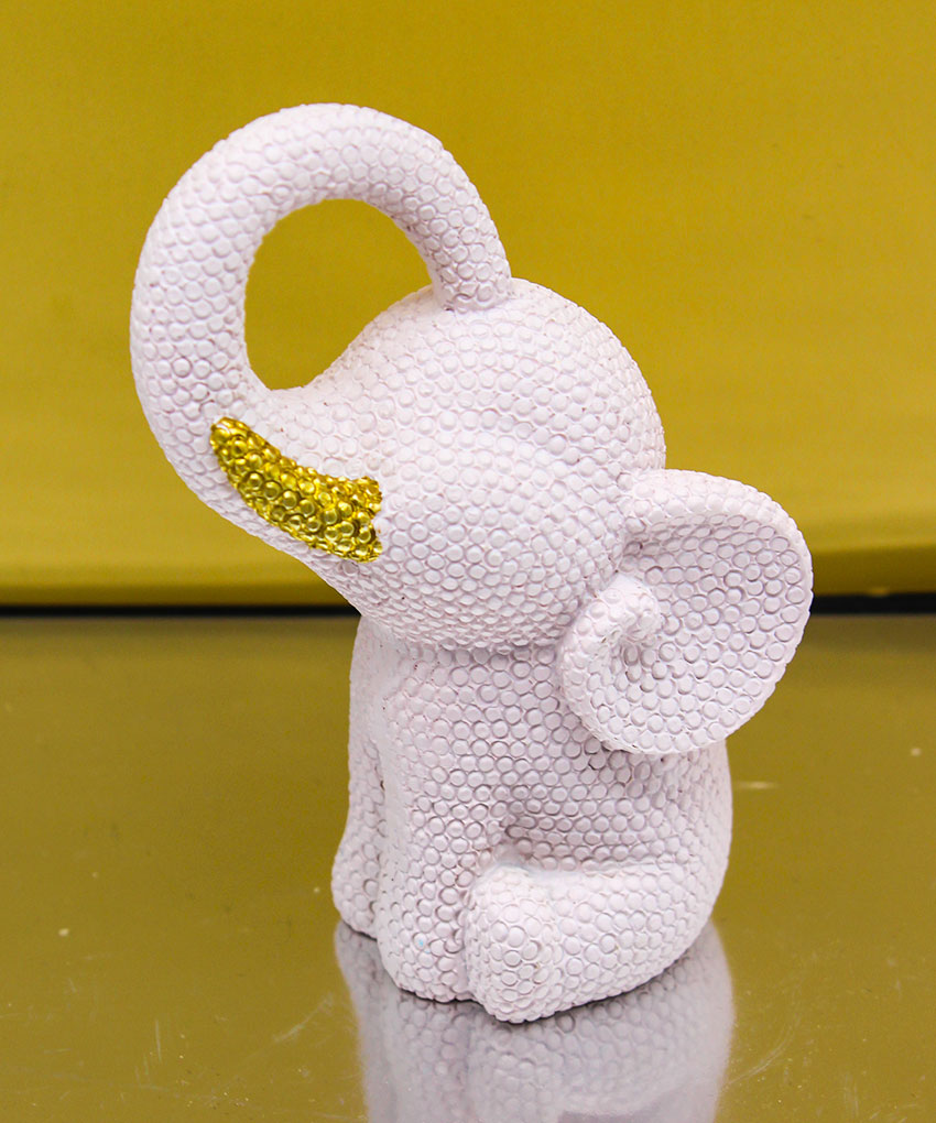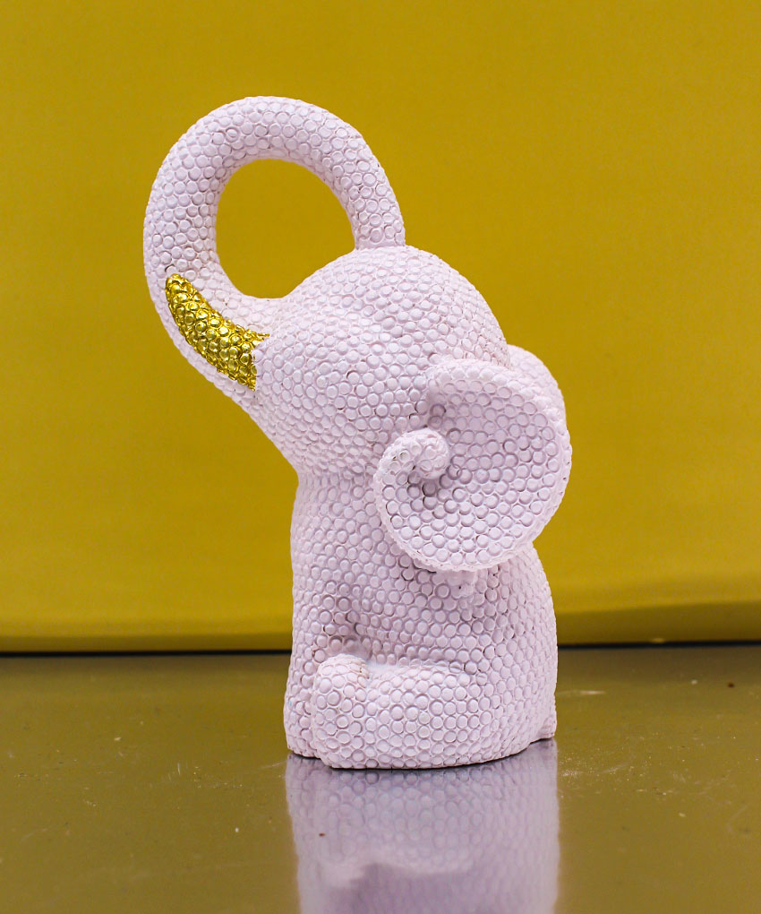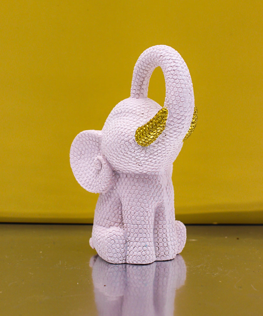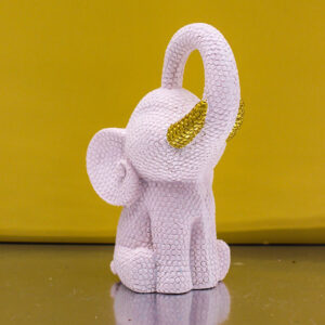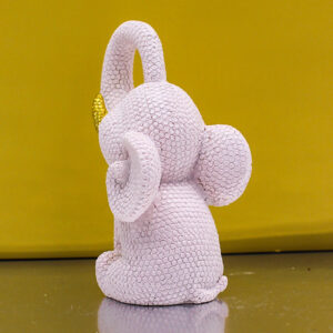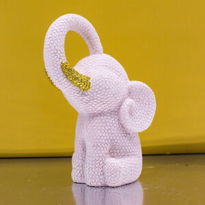 Realizzata in resina, questa tenera statuina raffigura un elefantino puntellato in colore Rosa, impreziosito da un delicato fiocco oro che dona luminosità e un tocco di raffinatezza all’intera composizione.