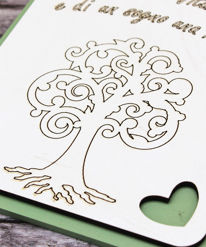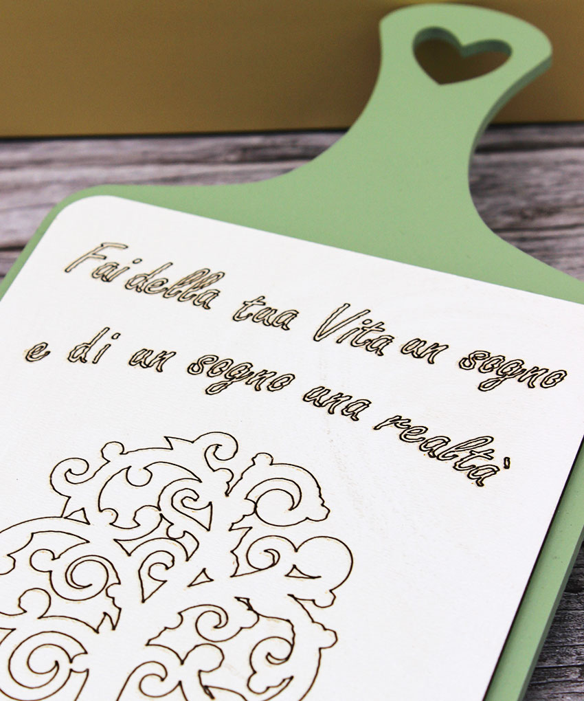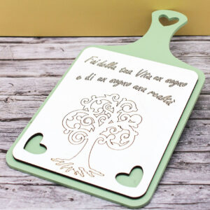La Bomboniera Tagliere con Albero della Vita e scritta in colore verde salvia è una scelta elegante e simbolica, perfetta per celebrare matrimoni, anniversari ed eventi speciali con un oggetto utile e di grande valore decorativo.