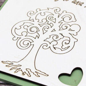 Tagliere decorativo con Albero della Vita e scritta colore verde salvia. Bomboniera elegante e simbolica per eventi speciali. Dimensioni 13 × 24 cm.