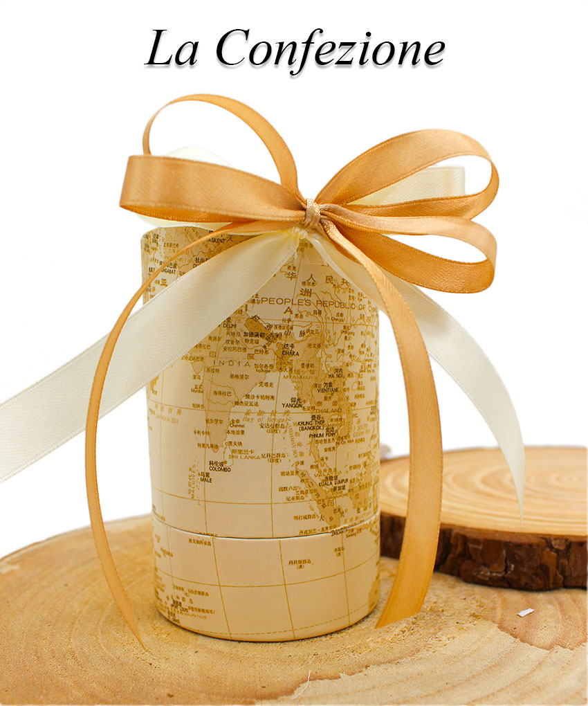 Completo di confezione elegante, con astuccio abbinato tema mappamondo, nastrini (colori a scelta) e confetti inclusi