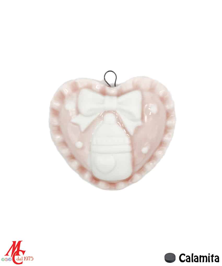 Bomboniera/Bustina Calamita Set Baby Cuore Rosa (Biberon – Sonaglino – Bavetta – Ciuccio)