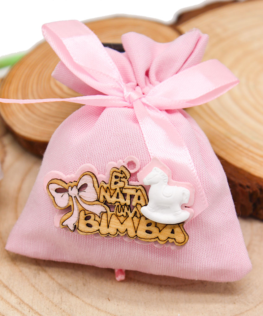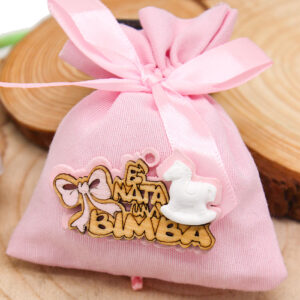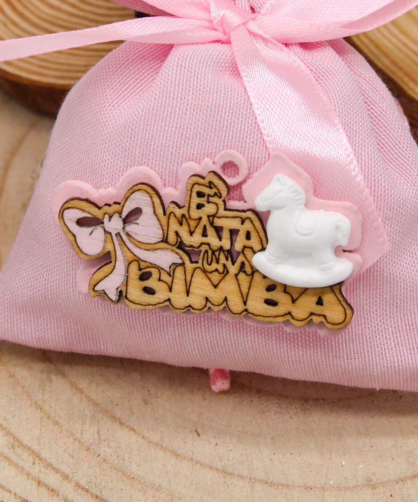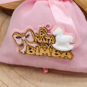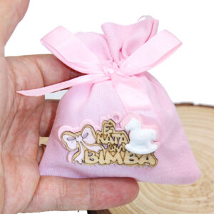 Delicata bustina sacchettino bomboniera di colore rosa, decorata con applicazione in legno raffigurante un cavalluccio a dondolo e scritta “È nata una bimba”. Una bomboniera dolce e simbolica, perfetta per celebrare la nascita di una bambina e donare agli invitati un ricordo tenero e significativo.