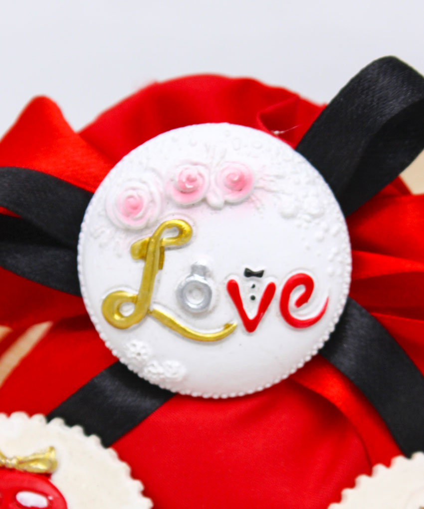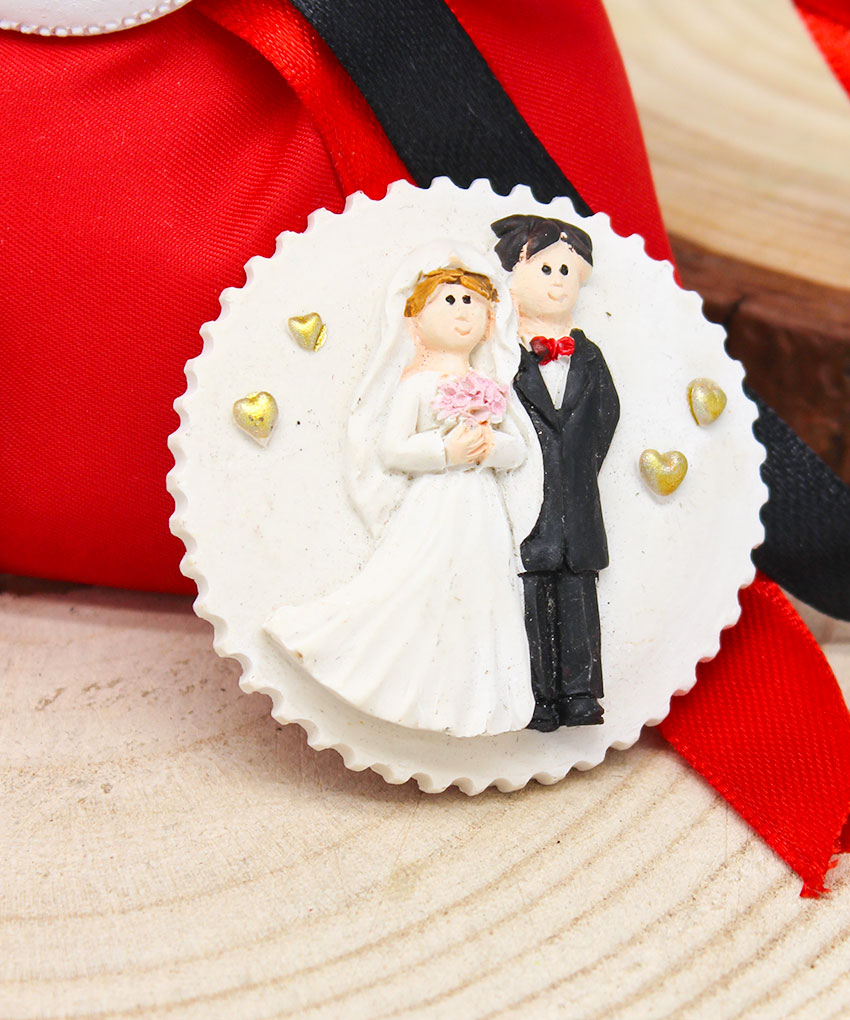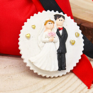 Realizzata in resina e proposta in 3 modelli assortiti, presenta una forma tonda da 5 cm con dolci raffigurazioni degli sposi.