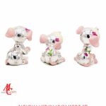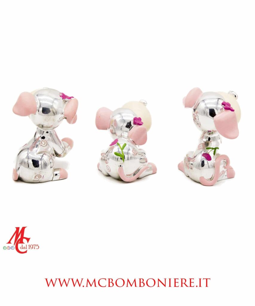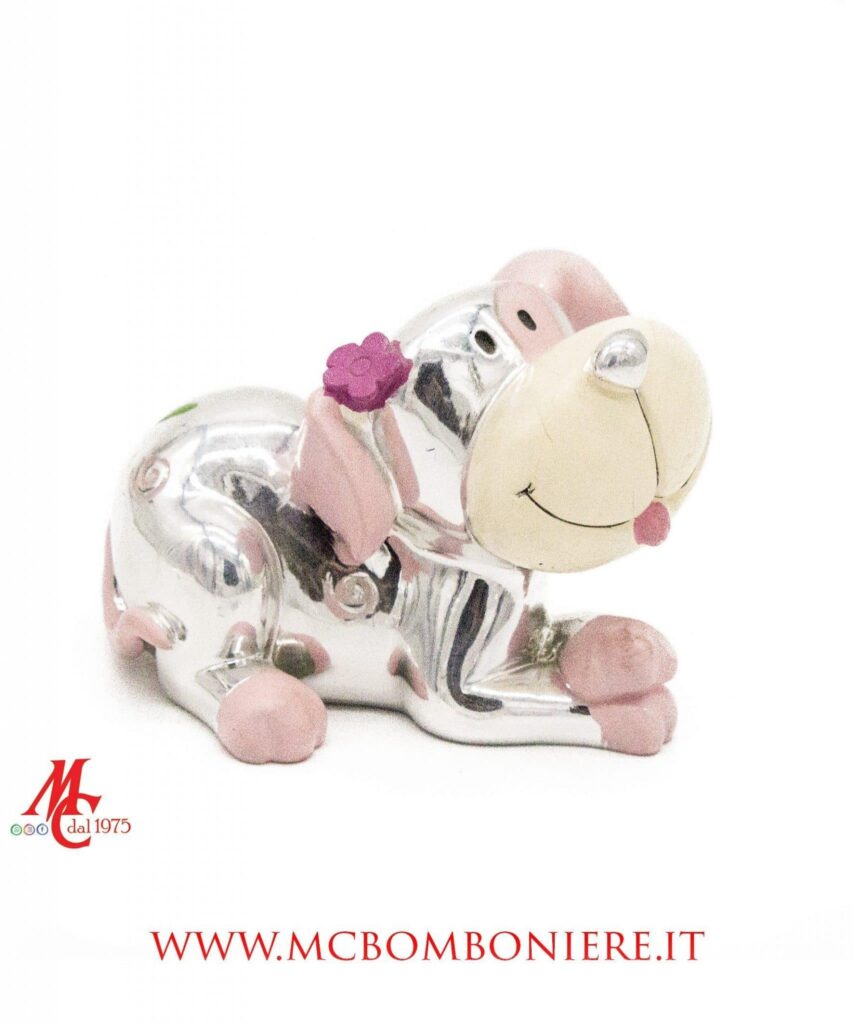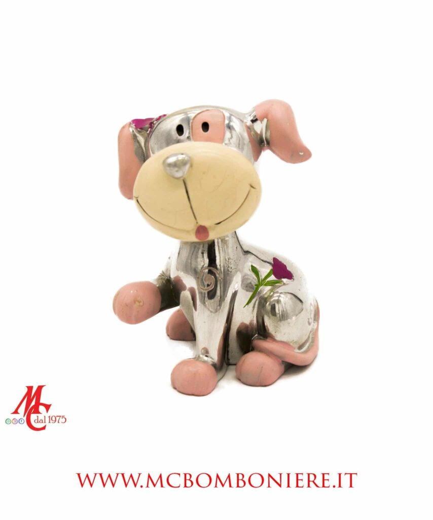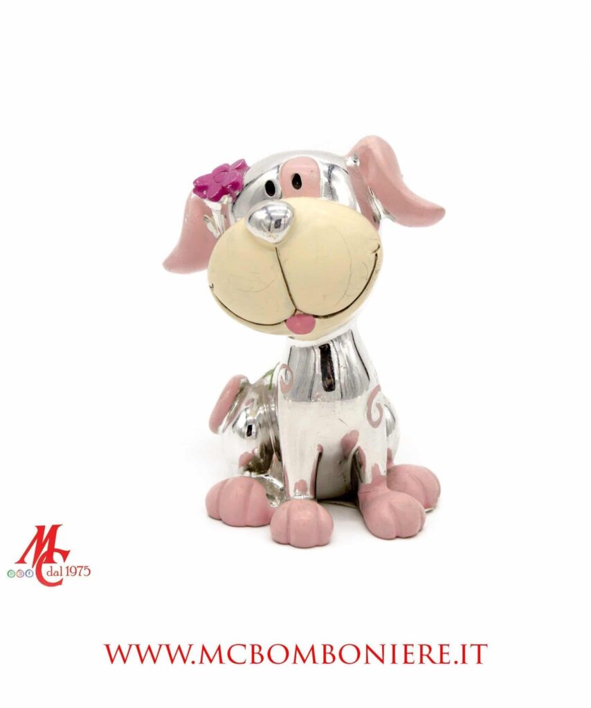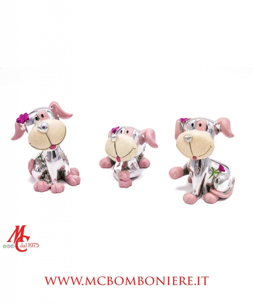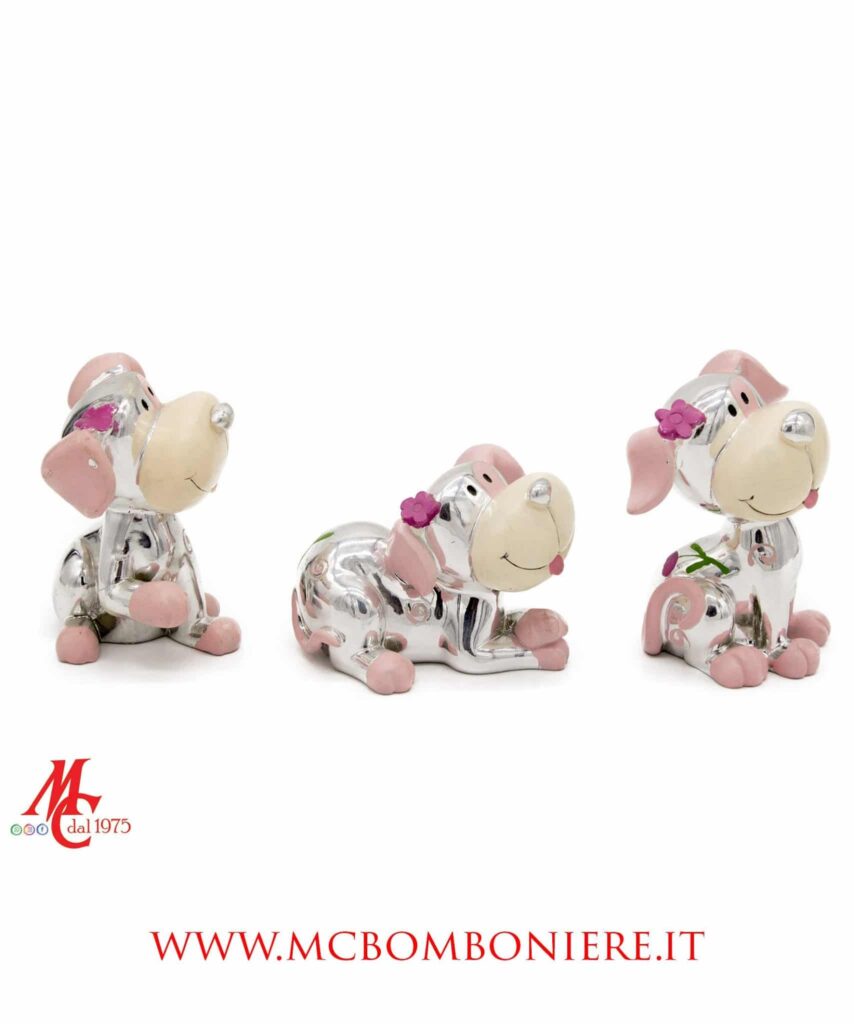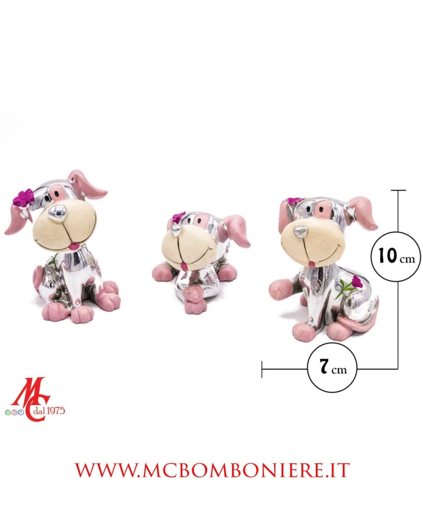 Dolcezza e raffinatezza si incontrano in questi cagnolini argentati in resina, proposti in tre posizioni assortite e in una delicata tonalità di rosa.