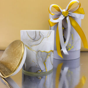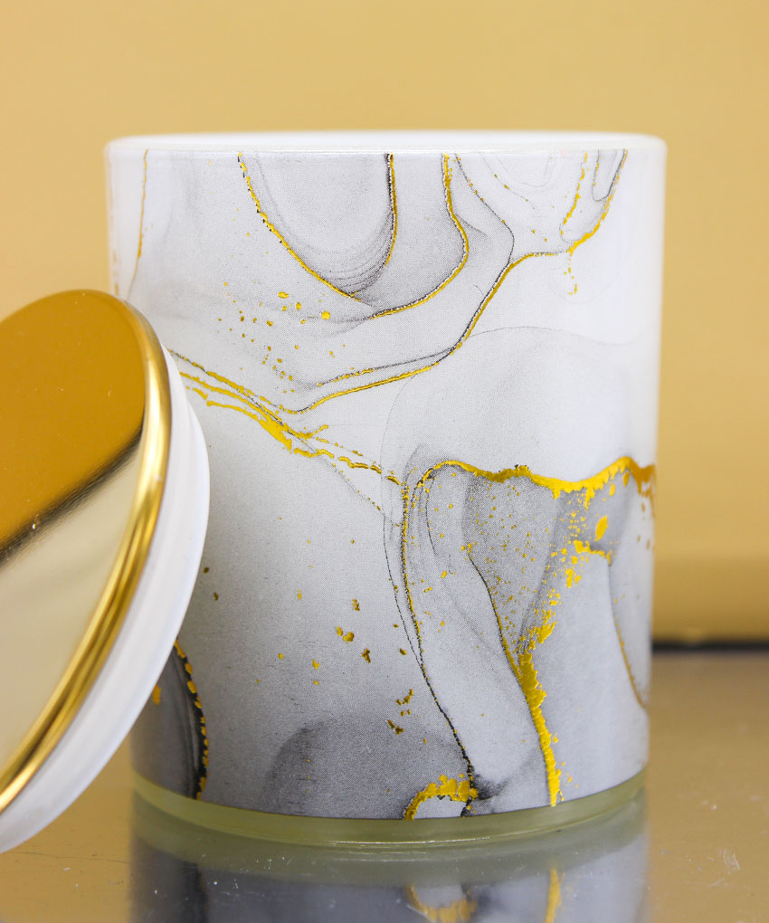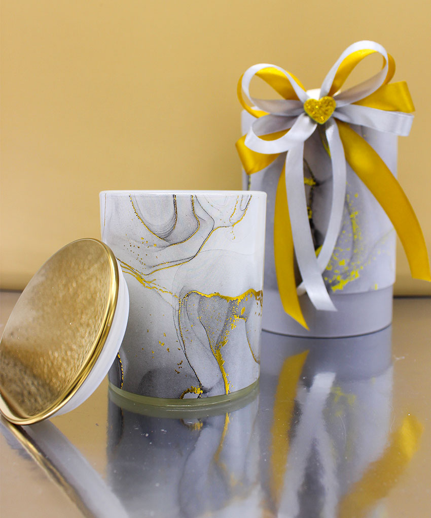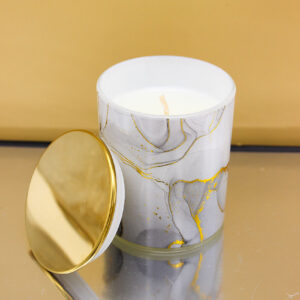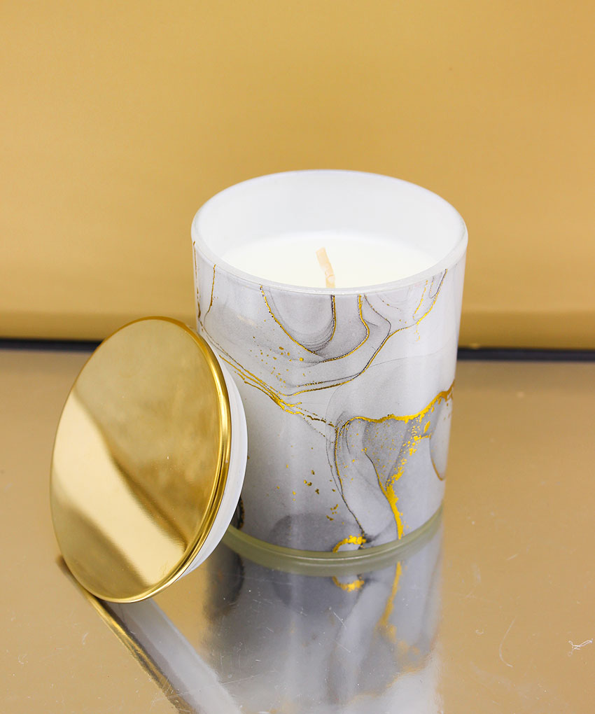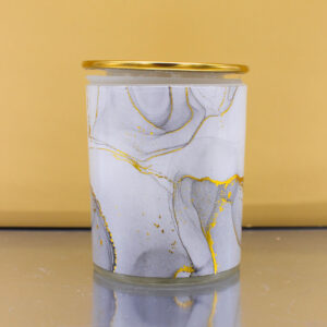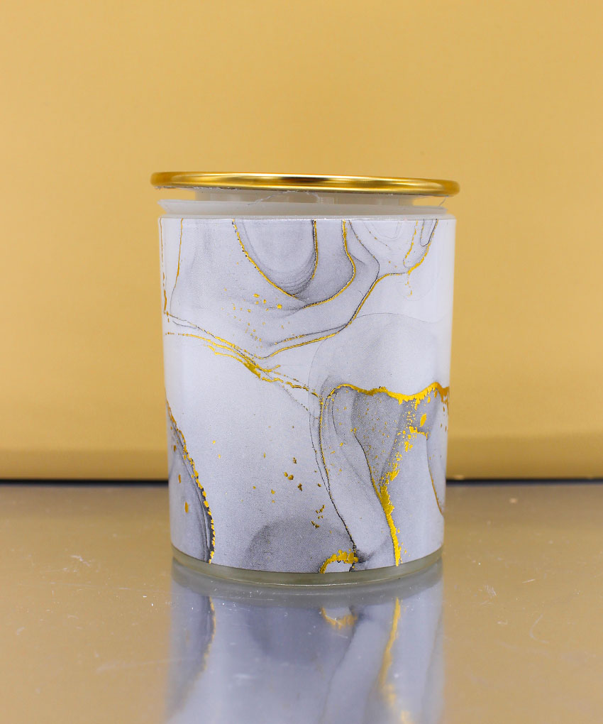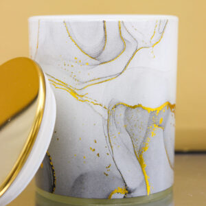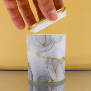 Un’eleganza moderna racchiusa in un design unico: la candela in bicchiere effetto marmo grigio con tappo dorato unisce stile e raffinatezza in un solo oggetto.